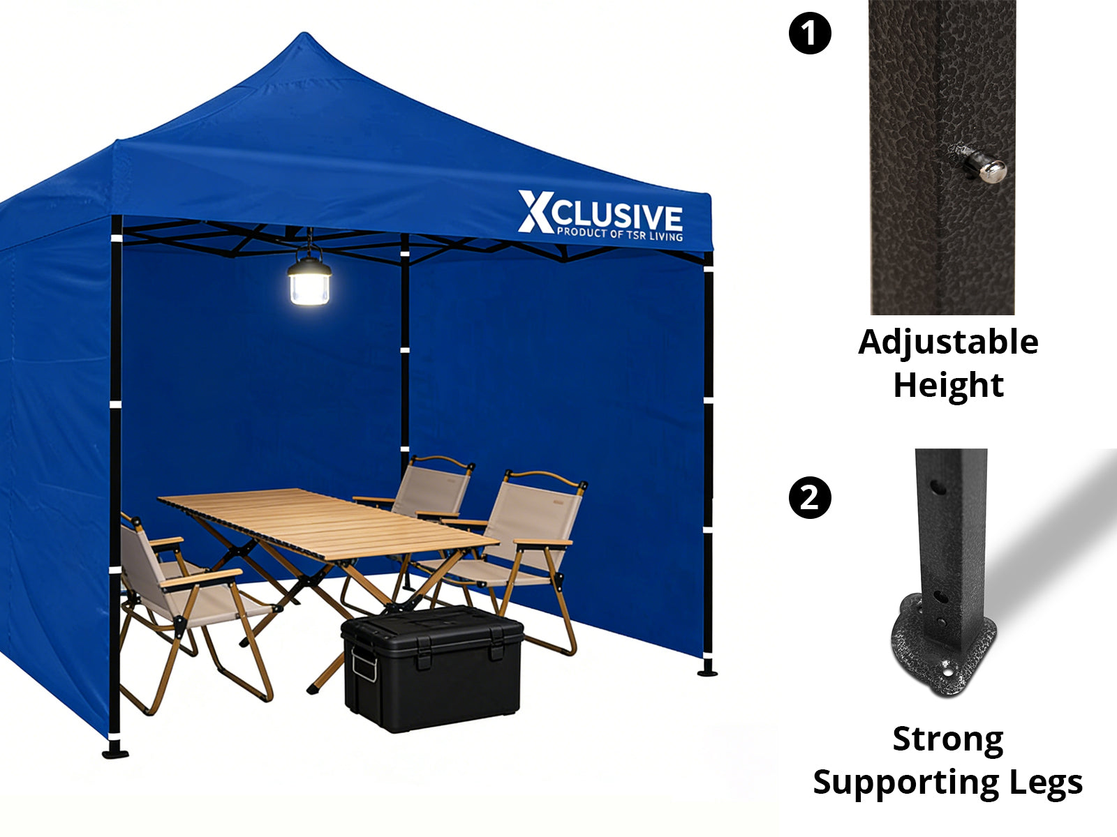 The Gazebo is made of waterproof and UV-resistant silver coating oxford fabric that holds up well and firm. The tent offers 3 panel enclosure to keep shade and cool. No more worries about hot summer days.Setting up the Gazebo is a breeze with all the necessary fittings and Velcro attachments already pre-fitted or attached for a hassle-free build. All you need to do is to prop it up, fasten and secured it, and you're ready to go. Select up to four different heights to suit your requirements. And when all is done, just fold and store it in the bonus Oxford-weave carry bag, get everything into the boot, ready for your next outdoor fete.