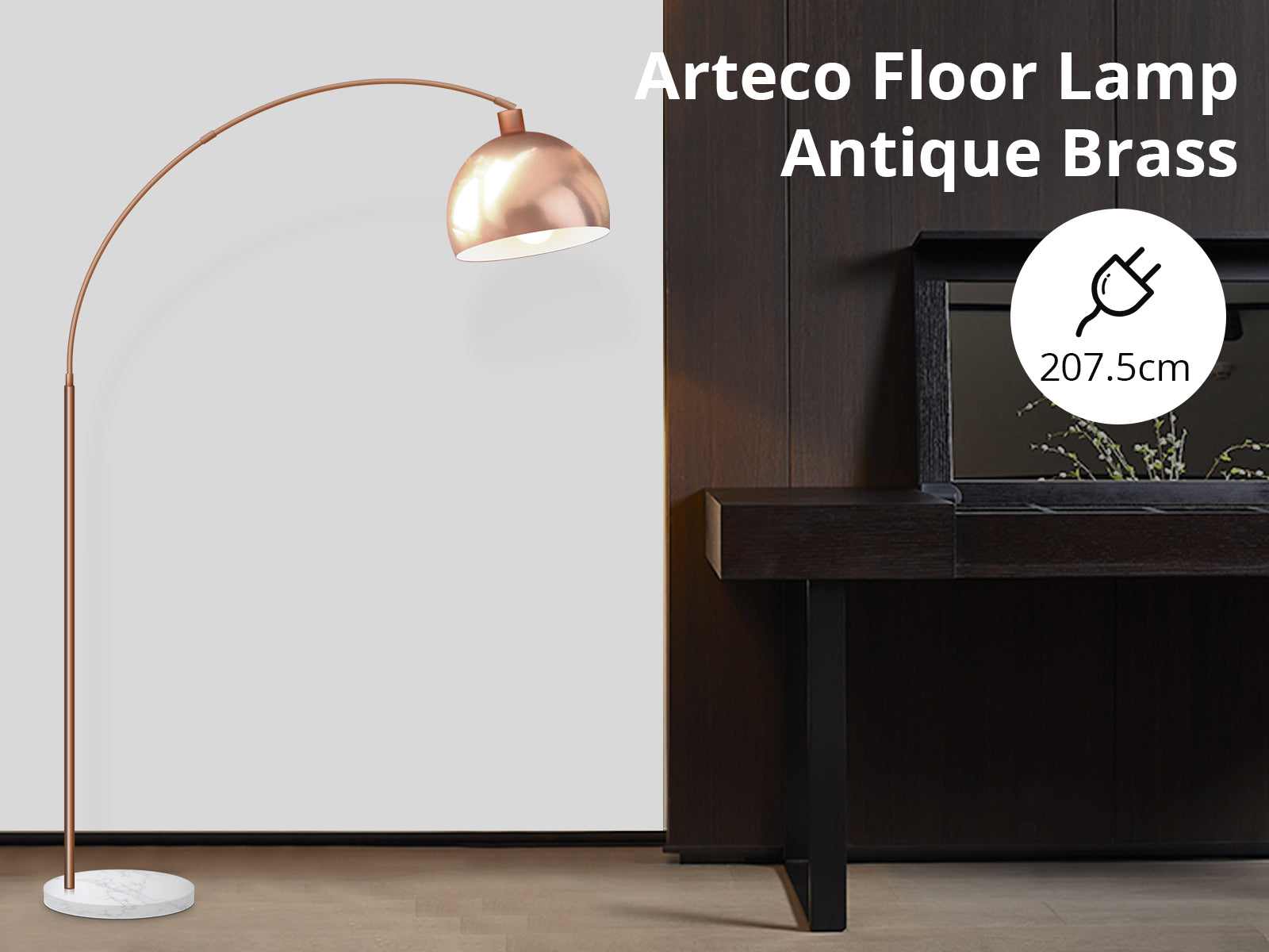 Architectural style makes this floor lamp a solid choice. Embellish a contemporary space with an outspoken accent. With finishes in antique brass and marble base, it plays to an upscale custom theme. An exaggerated arched body delivers lighting in a targeted space and creates a geometric effect. This gorgeous lamp stands out as a focal point in a living room or den.