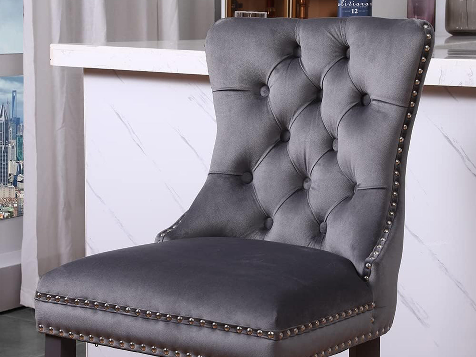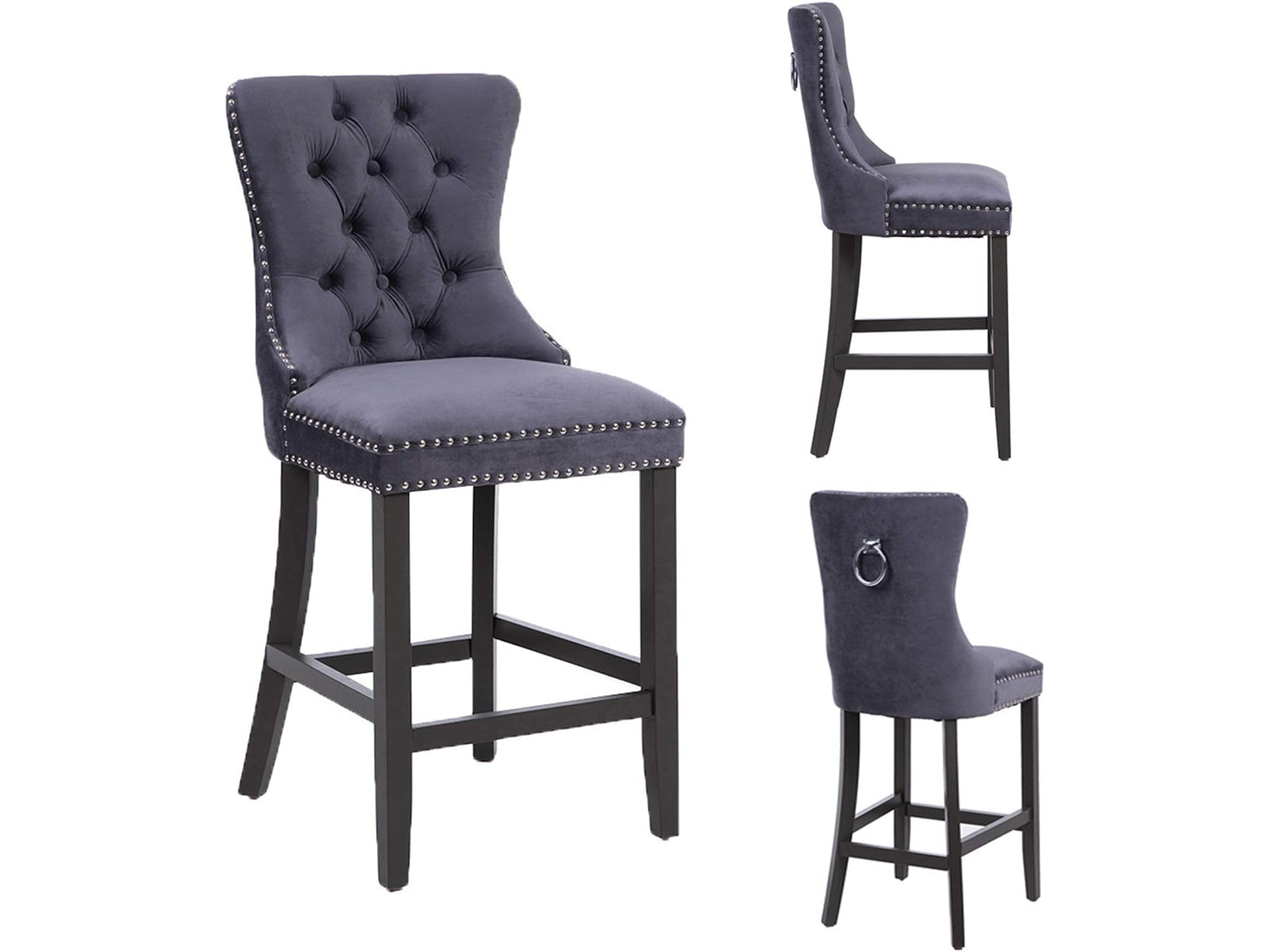 To look for a favorite option of bar stool matching the interior decoration, this product add a touch of glamor and elegance to your kitchen island & home bar with these button tufts, and meanwhile well match your kitchen floor with matt black legs. Wingback body full of nailhead trims on the edge and a metal ring in silver color on the back, all details designed to be eye-catching and comfortable.