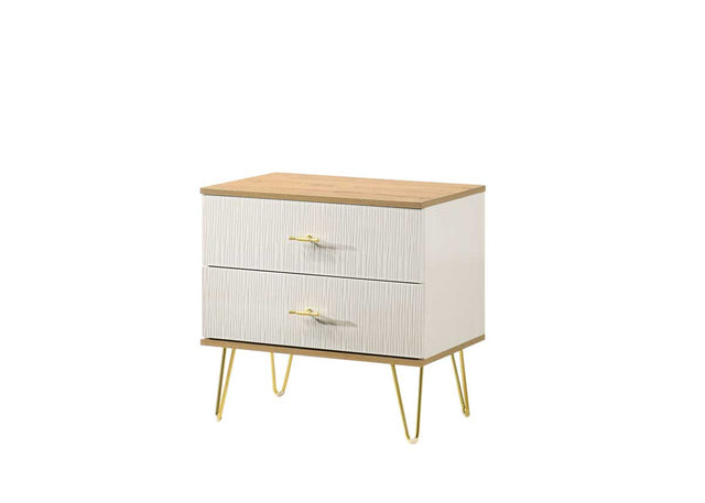 Bedside Table | White & Oak Finish | 2 Embossed Drawers & Gold Legs