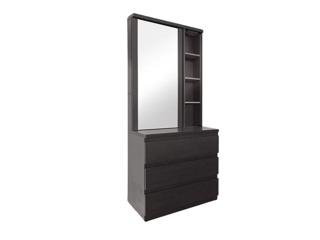 Refresh your bedroom with the Tiko Collection. This Tiko 3-Drawer Dresser brings classic charm and smart storage to your space. The design includes a sliding mirror cabinet with 3 hiding shelves, three handle-less drawers, and glass side shelves. It's perfect for storing your makeup, jewelry, and beauty tools. Its double-extension ball-bearing drawers offer smooth and durable access. Featuring a modern black oak finish and a tall vertical form. The space-saving dresser is ideal for bedrooms where style and function matter.