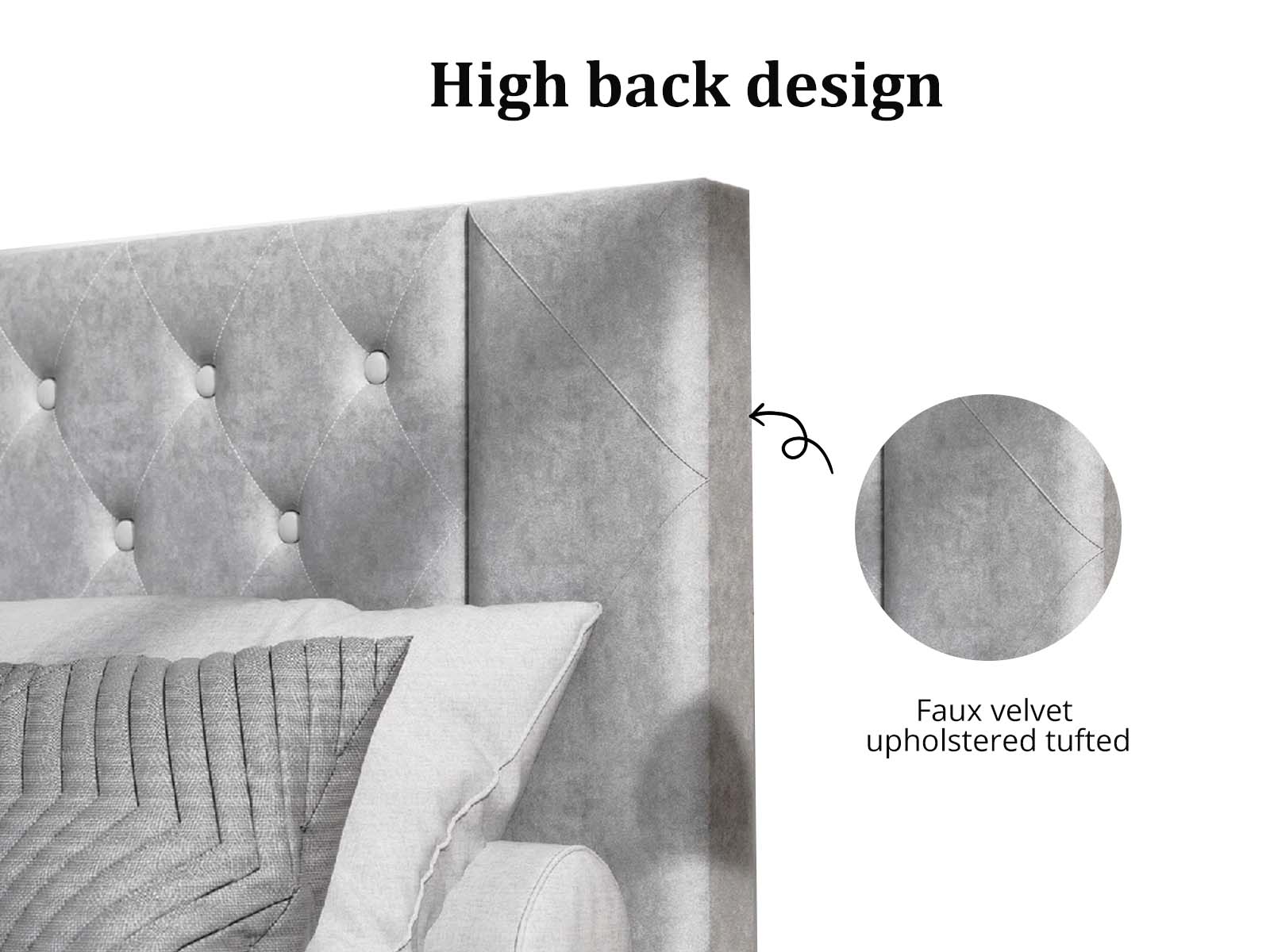 Double Bed Frame & Mattress Combo | Grey Velvet Upholstery | High Back Headboard | 21 cm Thick Mattress | Soft-Medium | Pillow Top Design