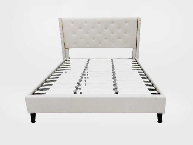 King Bed Frame | Beige Linen Upholstery | Elegant High Tufted Headboard