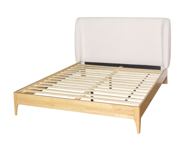 Transform your bedroom with the stylish Otaki Fabric Bed Frame. This bed frame features a soft cream boucle headboard with curved wings for ultimate comfort. Inspired by midcentury modern design that suits contemporary New Zealand homes. Built with a wooden veneer base and solid wood legs for lasting strength. Supports up to 300kg weight capacity. Perfect upholstered bed for bedroom updates.