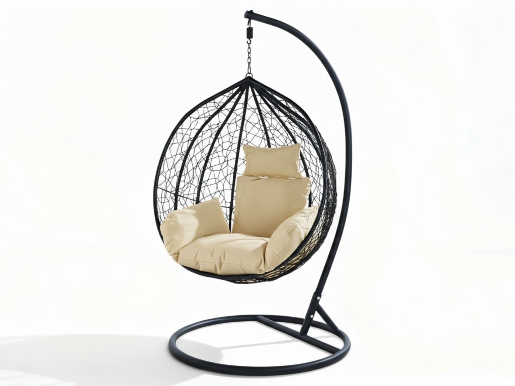 Hanging Egg Chair | Black Frame & Beige Cushions | Modern Rattan Style