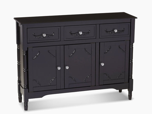Add sophistication and storage to your home with this Wood Console Sideboard Table. Ideal for entryways, dining rooms, or living spaces. It offers three spacious drawers and three doors with shelves behind for storage. Antique elegant knobs and decorative polyresin accents bring a timeless charm. And the solid wood, veneer, and MDF construction ensure lasting durability. Perfect for storing dinnerware, linens, or home décor, this piece is both stylish and practical.