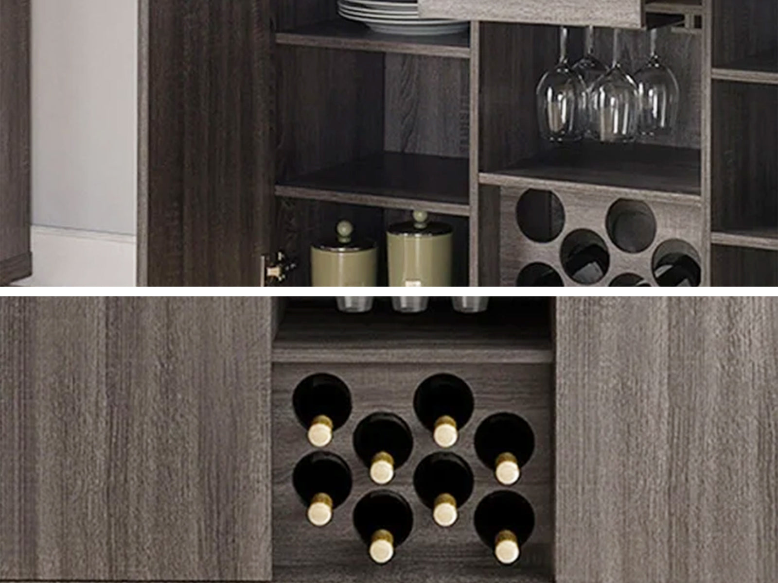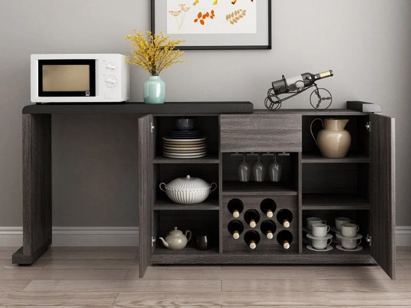 Grace your dining space with this clean, extendable kitchen sideboard buffet table. It is a modern-inspired design that's as functional as chic and timeless. With crisp, clean lines in gray and black color, it enhances a touch of contemporary appeal and streamlined beauty. Come with a space-saving silhouette, it could be extended over 50" in need. Behind two doors, you will find four shelves that provide out-of-sight space to effortlessly corral all your odds and ends. More importantly, the center storage area is perfect for storing your favorite wines and glasses. Style, function, and quality make this buffet table a wise addition to your home. Assembly is required.