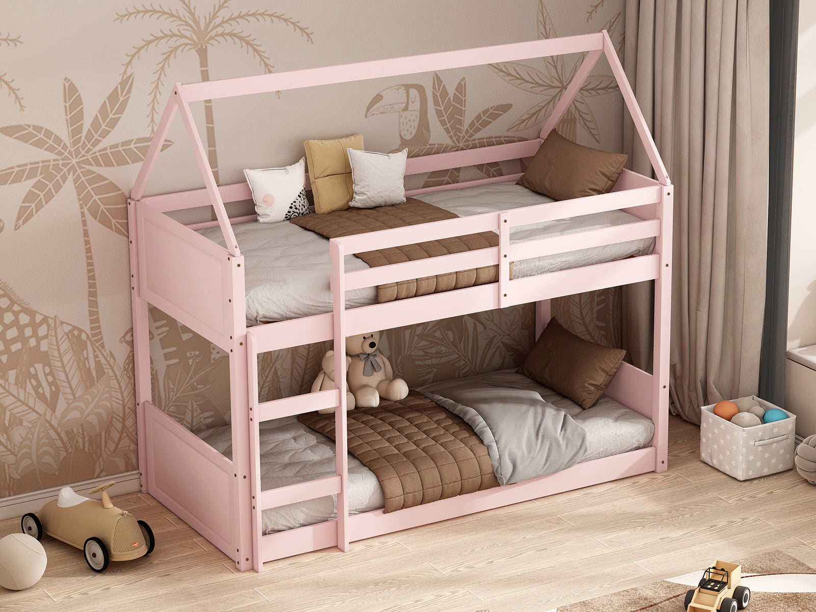 Bunk Bed | Pink Solid Pine Frame | Space‑Saving Design with Upper Guardrail
