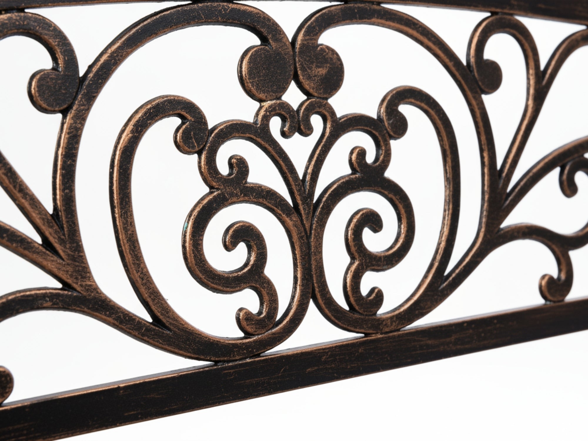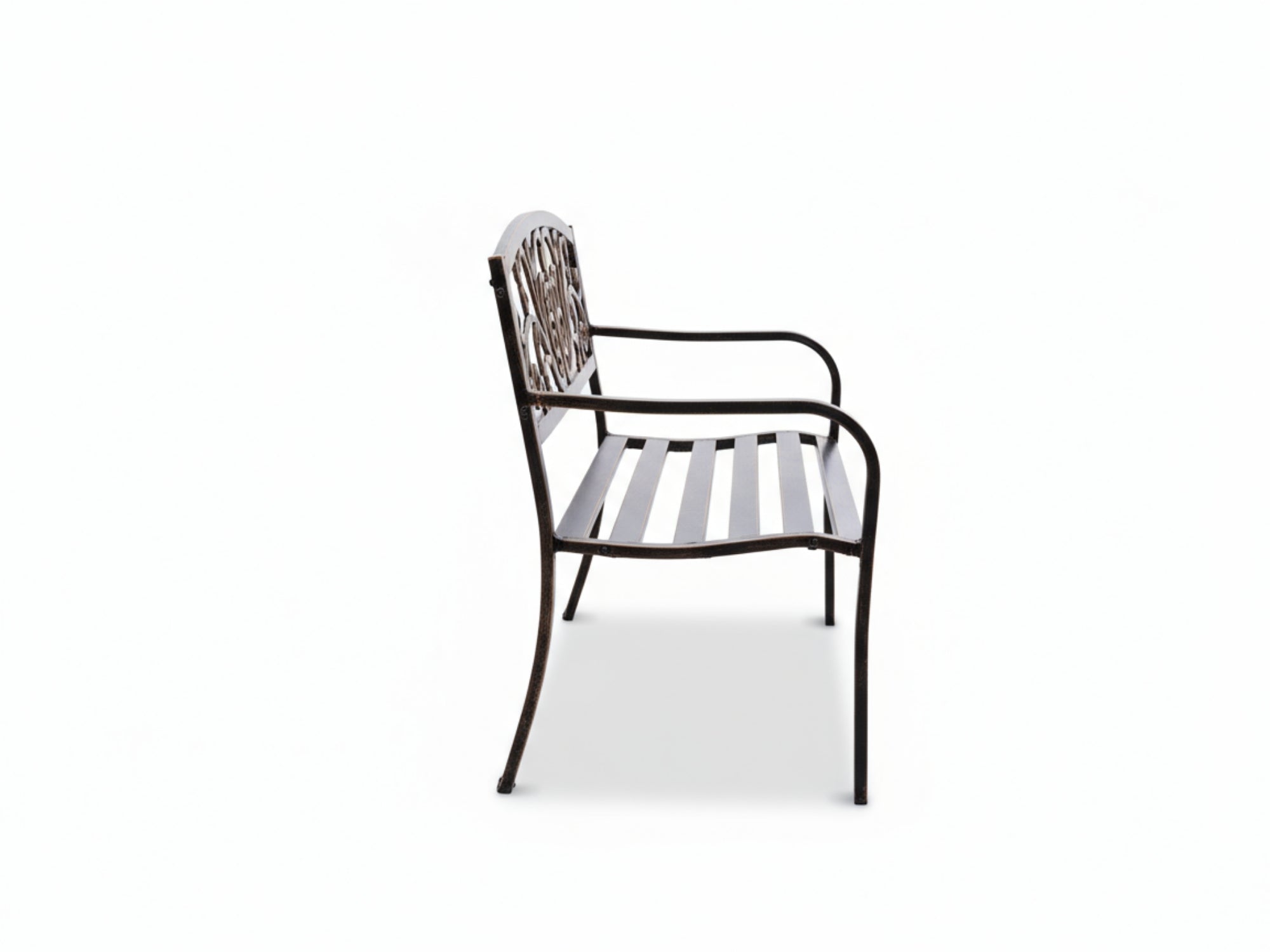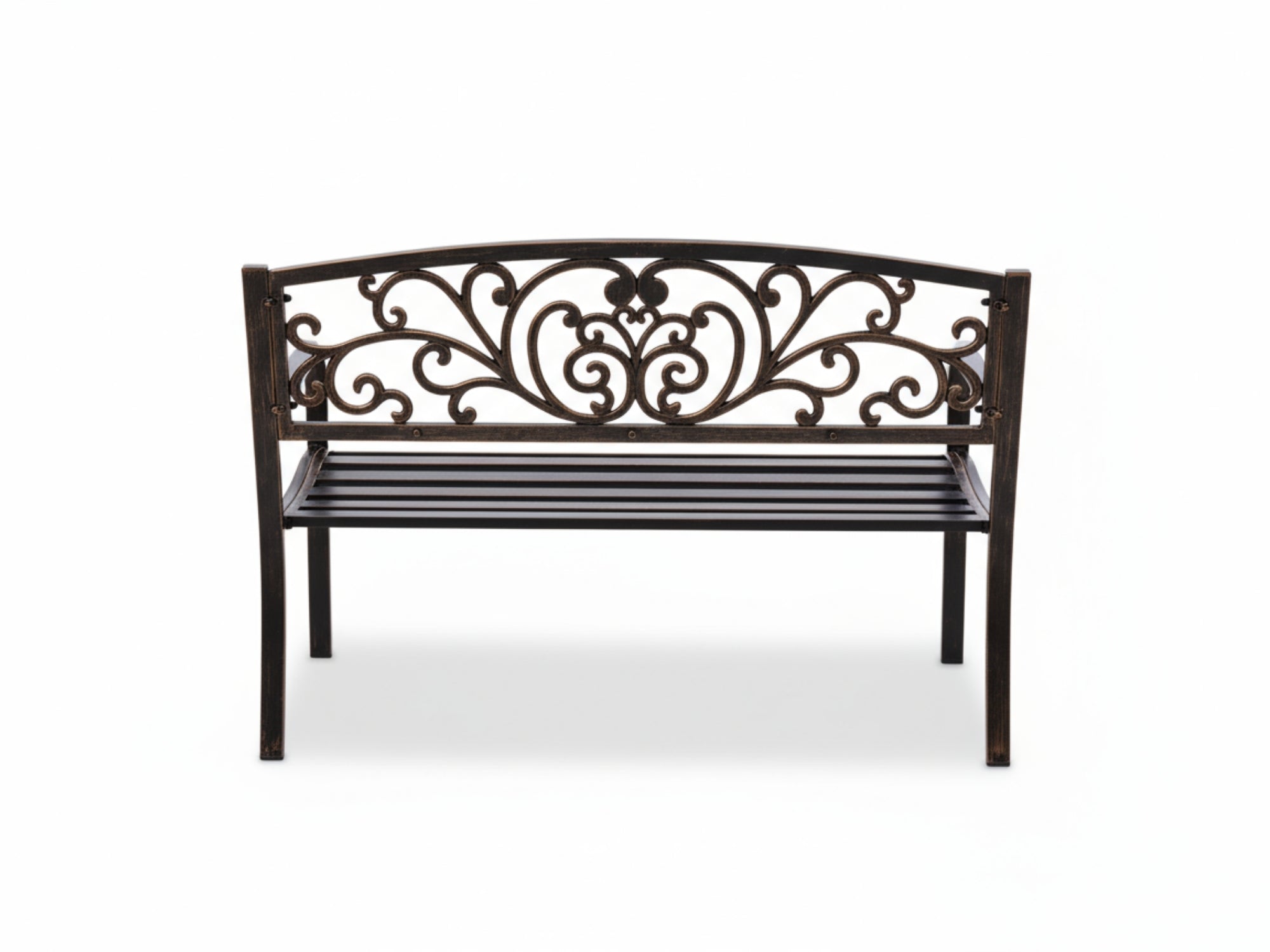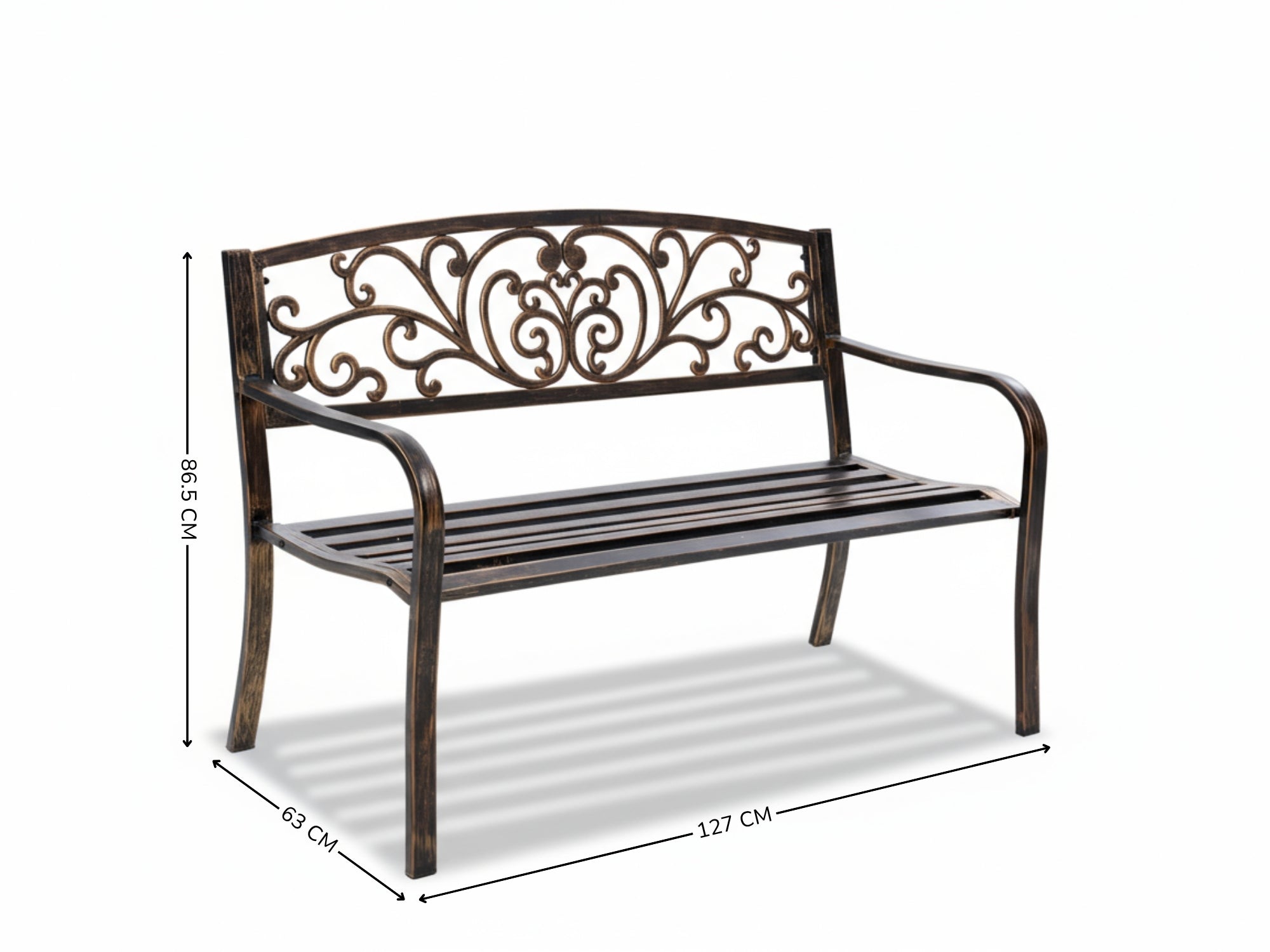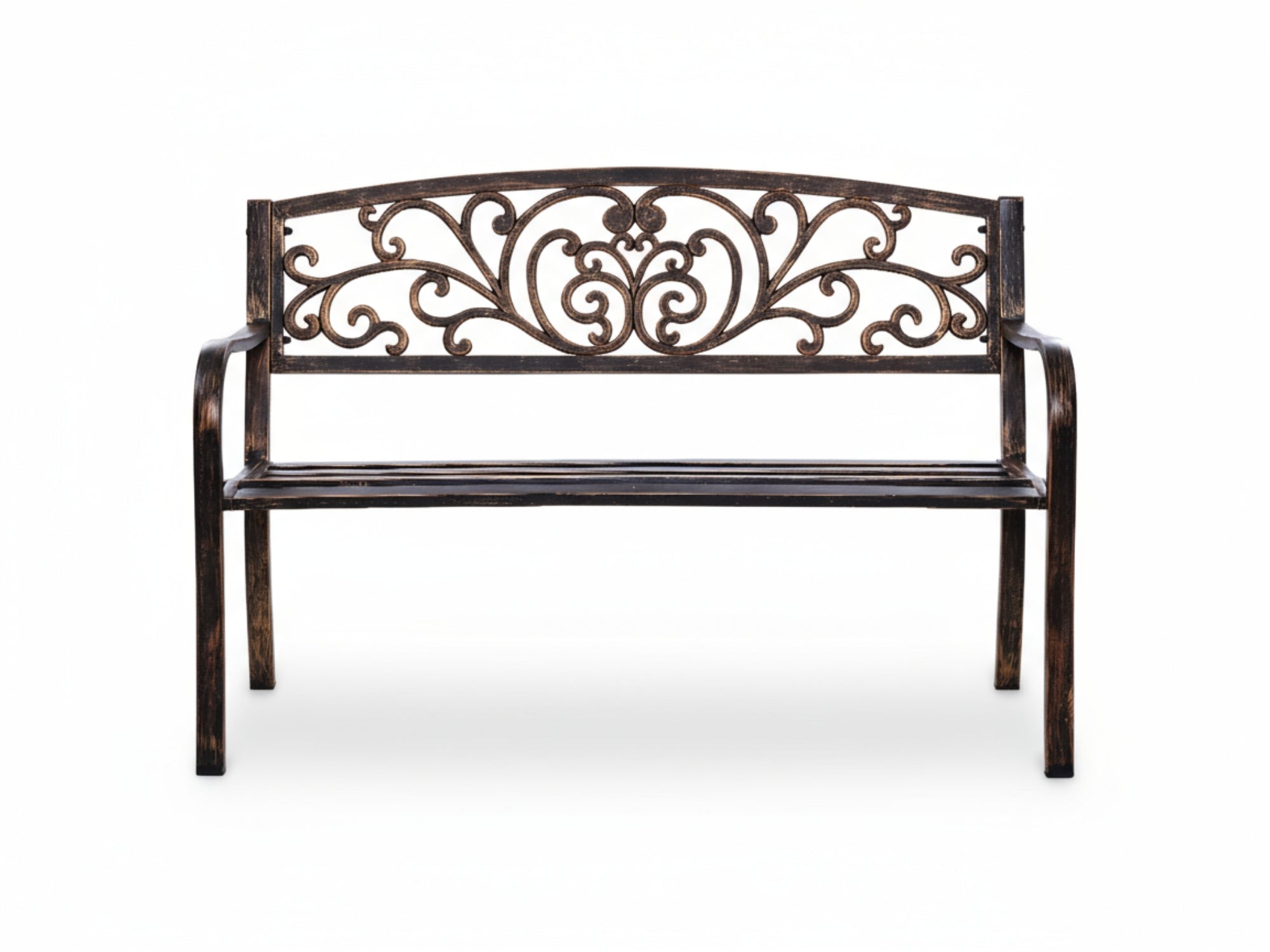 - Our outdoor bench is made of sturdy cast iron. The surface comes with a layer of protective waterproof coating. Cast iron construction makes this patio bench heavy-duty-oriented and durable enough for long-term usage.