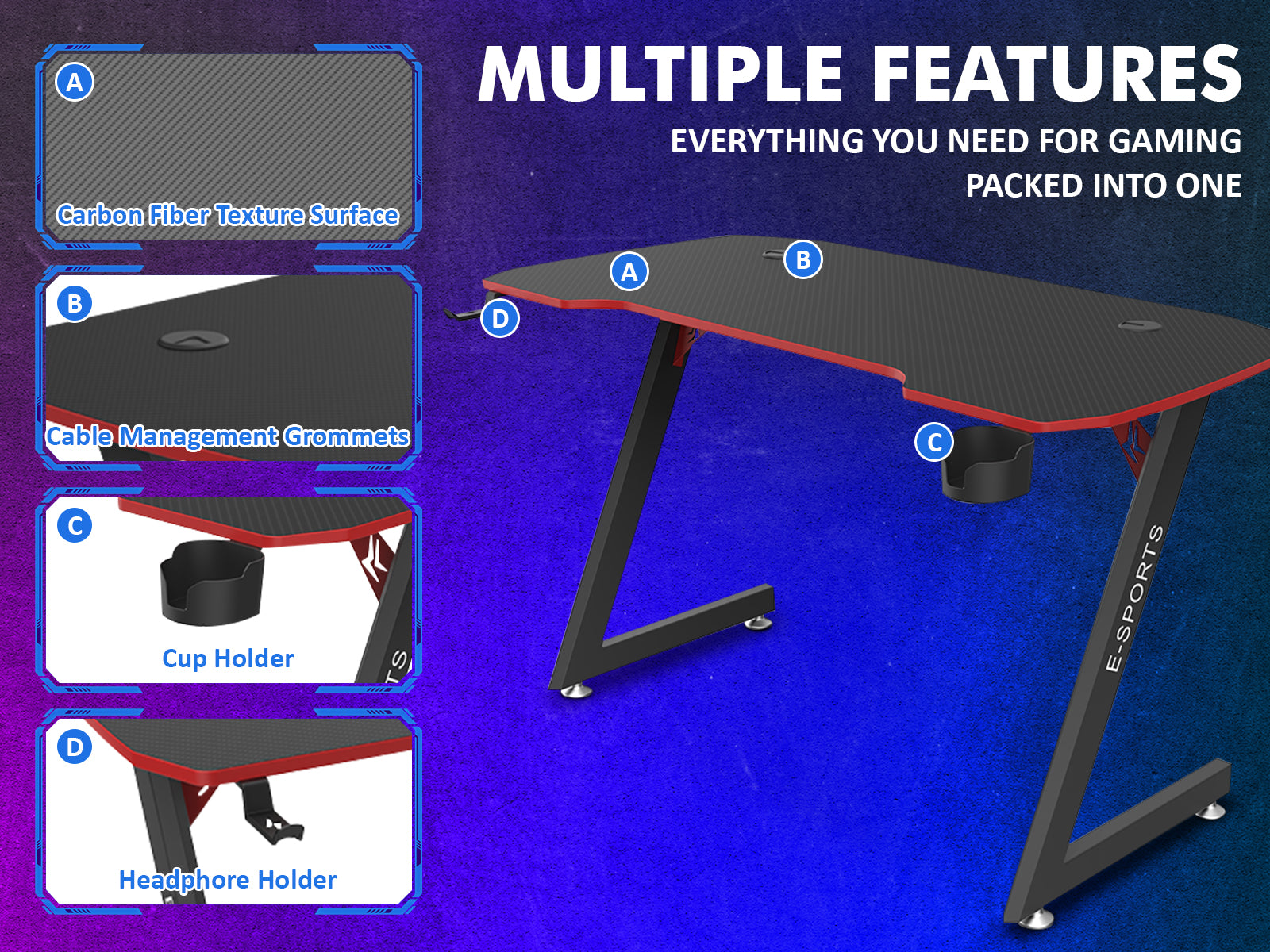 Designed for avid gamers, this gaming table is both stylish and practical. To make your gaming experience more convenient, this gaming table has a spacious and sturdy surface, which means you have enough room to keep your gaming PC, monitor, keyboard, mouse, and other essentials. For ultimate durability and sturdiness, the gaming table features a powder-coated solid steel frame and 15mm thickness. It has a 90kg weight holding capacity. Furthermore, the table features sleek, z-shaped legs, which ensures ultimate stability and prevents shaking. It also has an adjustable foot pad for better support. For ease of use and additional convenience, this gaming table boasts a carbon fibre texture that makes it waterproof, non-slip, and easy to clean. With so much that it has to offer, bring home this gaming table to take your gaming session to the next level.