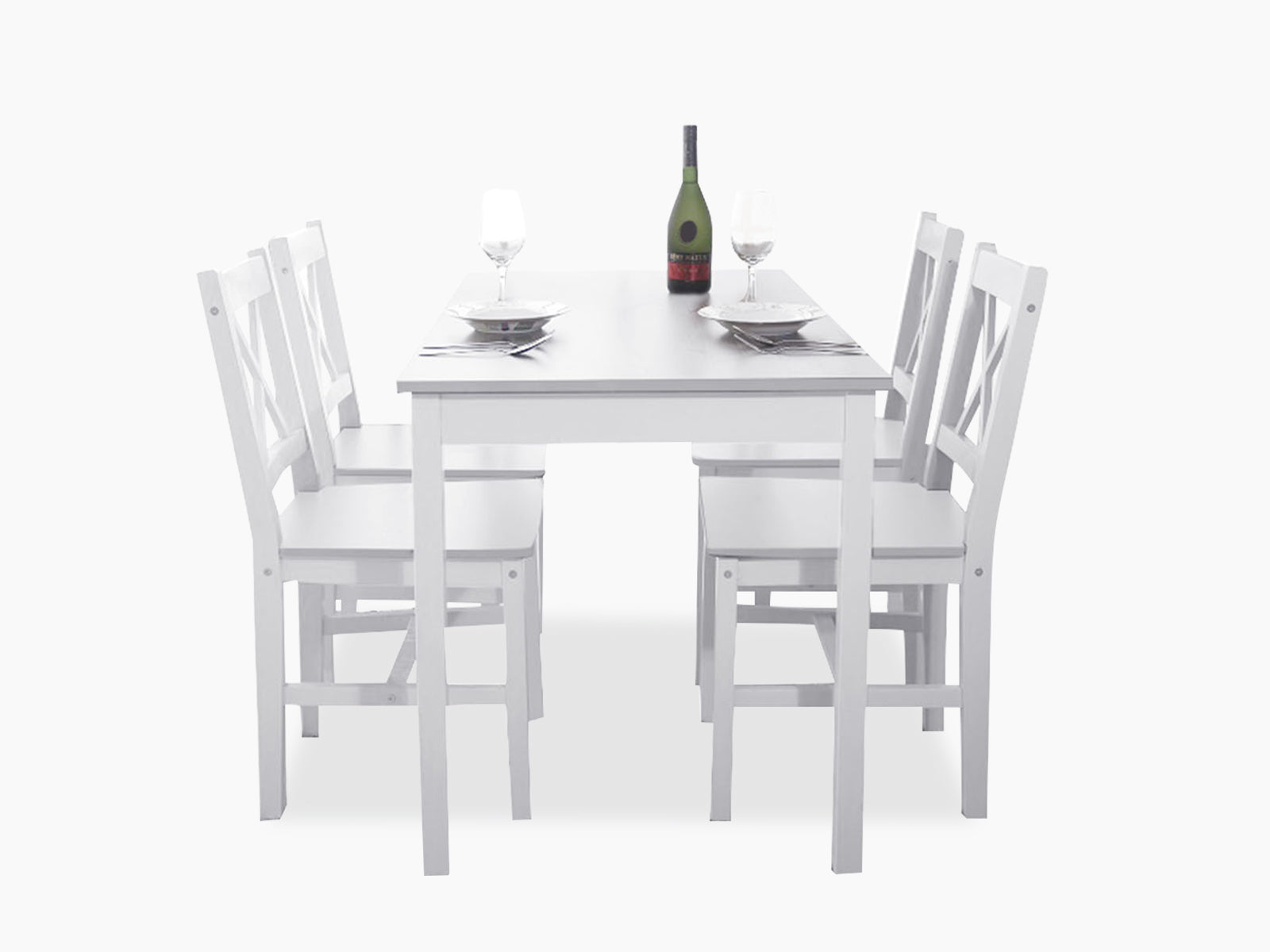 The Ajax 5PC Dining Set is the perfect choice for compact dining spaces. Crafted from solid pine wood, it features a sturdy rectangular table in a stylish white finish. The design of the table legs offers plenty of legroom, making it practical and comfortable. Accompanied by four matching dining chairs. This set blends classic charm with everyday function. Easy to clean and simple to assemble, the Ajax Dining Set adds warmth and elegance to your kitchen or dining room.