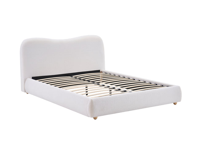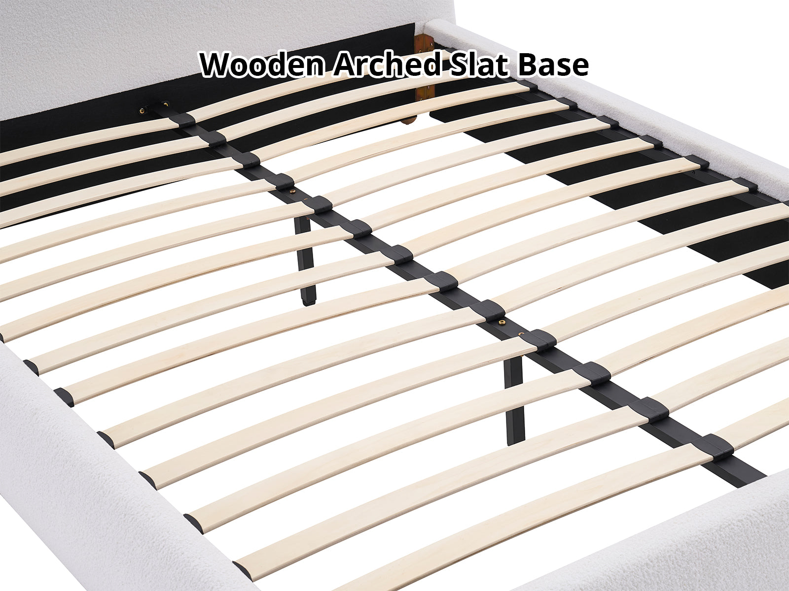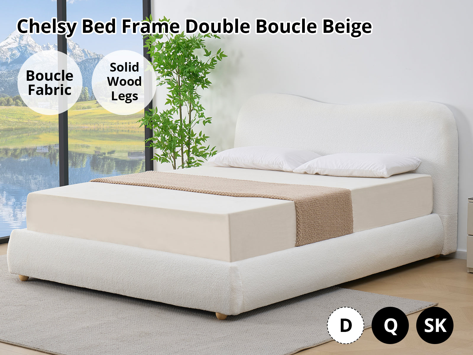 Add comfort to your bedroom with the luxurious Chelsy boucle bed frame. This bed frame is made with soft, premium boucle fabric that feels smooth to the touch. Features a padded headboard with high-density foam for comfort while reading or watching TV. The wooden arched slatted base flexes naturally and reduces partner movement. Thick slats provide strong mattress support. Built with heavy-duty metal fittings and solid legs for lasting quality. Beautiful cream color suits any bedroom style in New Zealand homes.