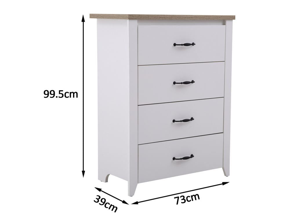 The Adelle Collection suits any country-style home. It features a natural oak top paired with a white body, creating a fresh, modern look. This Adelle 4-Drawer Tallboy is made from quality engineered wood with a woodgrain melamine finish. It’s built to last. The drawers have black vintage handles and smooth metal runners for easy use. Its slim and tall design makes it a great fit for small bedrooms or tight spaces. With sturdy construction and stylish design, Adelle offers affordable, durable bedroom furniture perfect for the latest country style trends in NZ homes.