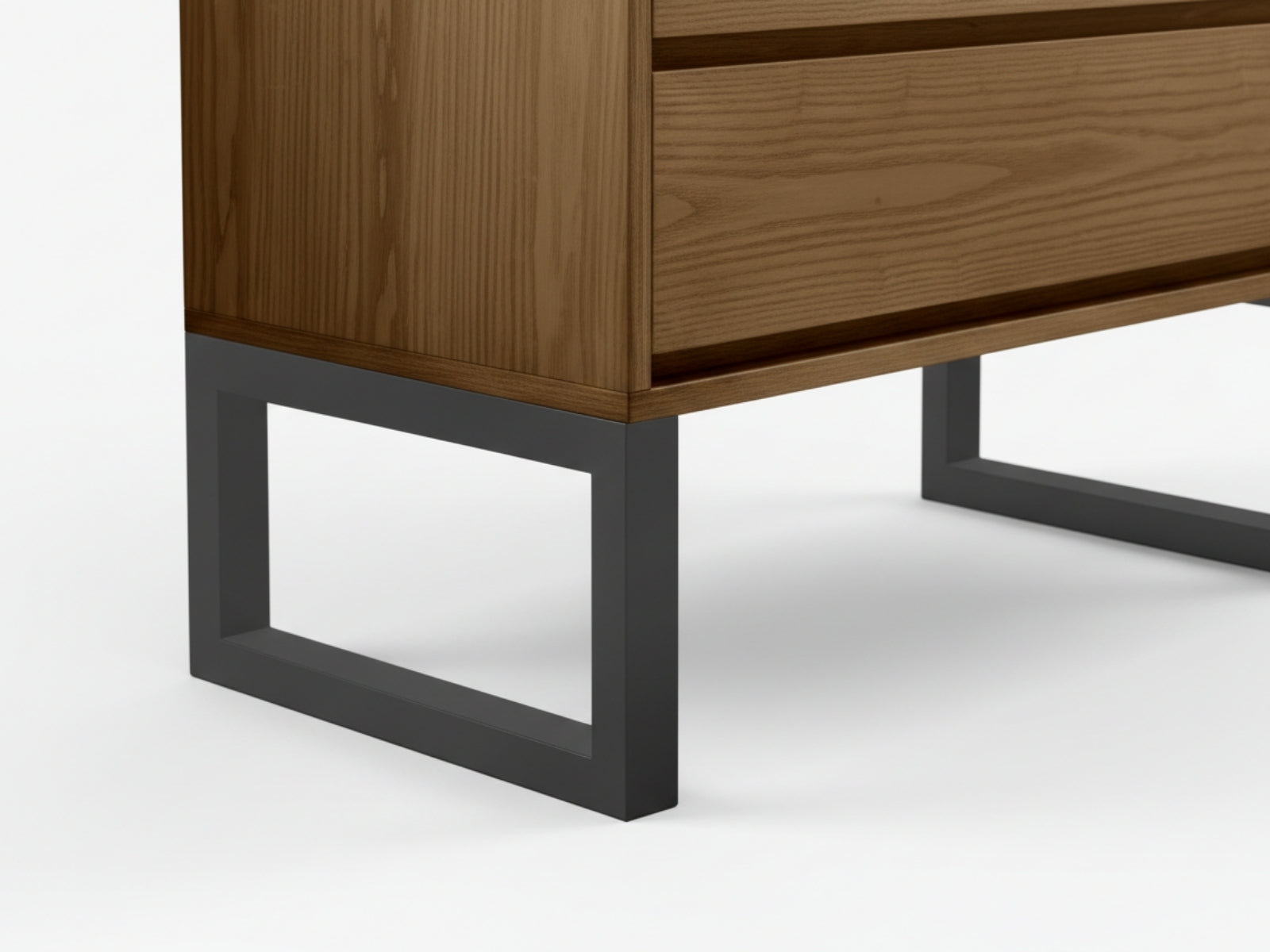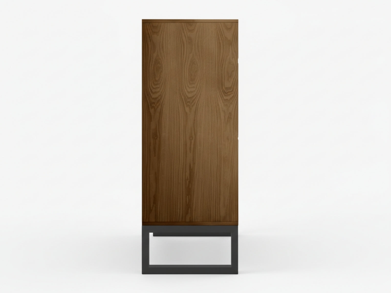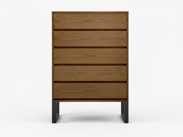 Add warmth and modern style to your space with the Philip 5-Drawer Tallboy. Made with a poplar wood frame and ash veneer panels, this chest blends durability and elegance. The walnut finish contrasts beautifully with the charcoal metal legs, while five spacious drawers provide practical storage. Perfect for bedrooms or hallways.