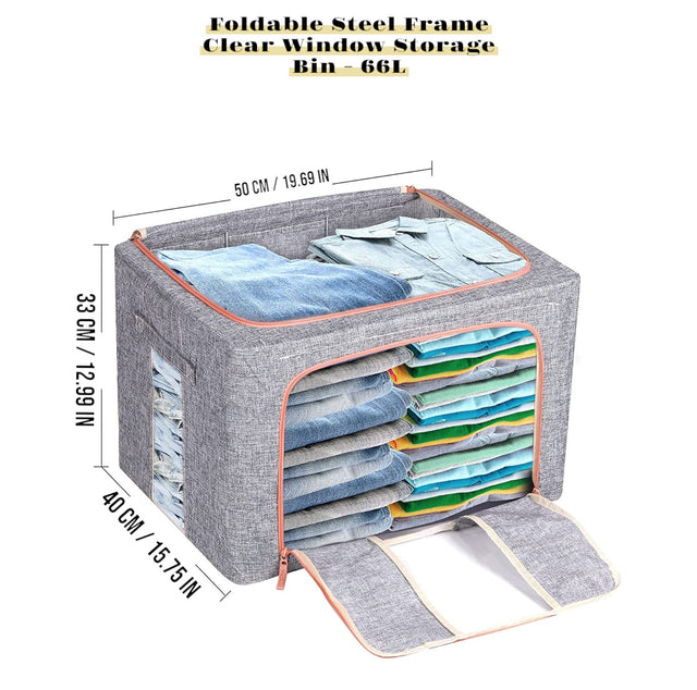 These 66L foldable storage bins feature a strong steel frame, clear windows, and dual zipper access for organizing clothing, bedding, or toys with ease and visibility.