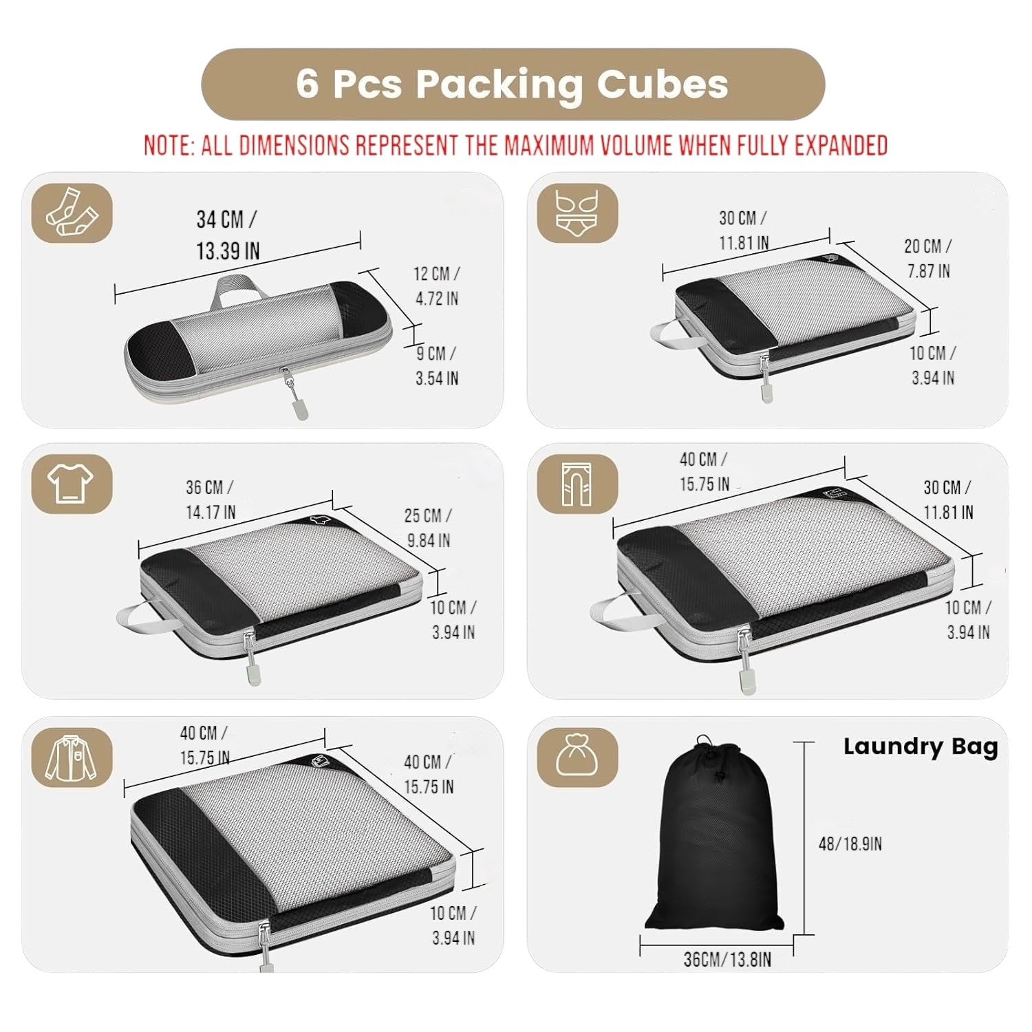 6pcs Compression Packing Cubes Travel Luggage Organizer Set – Black