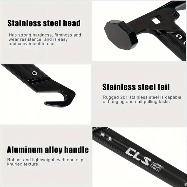 A multifunctional camping hammer with a stainless steel head and tail hook, ideal for setting up and removing tent pegs. Designed with an aluminum alloy handle for a firm grip and minimal fatigue during prolonged use.
