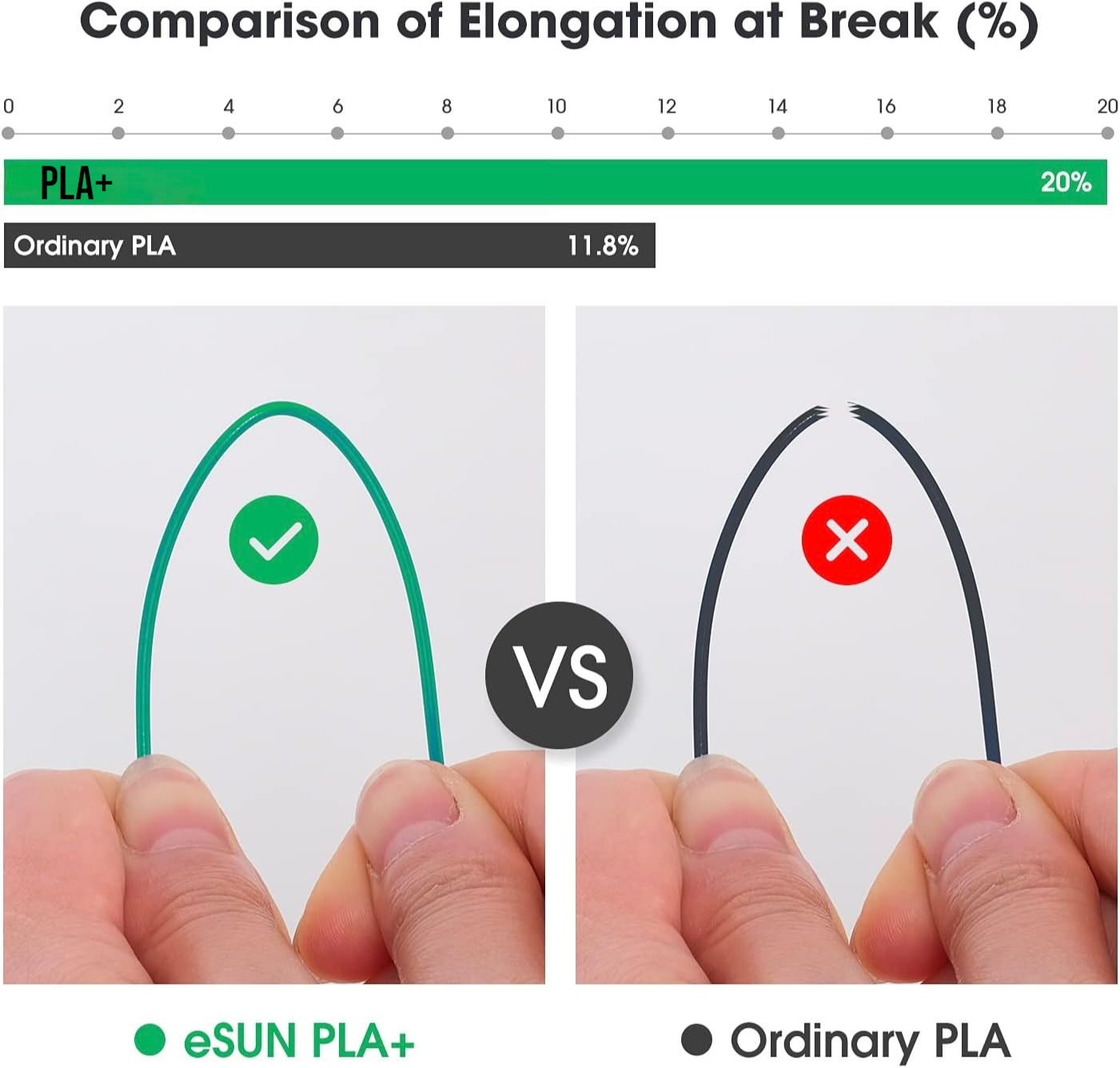 1. Improved toughness with elongation at break reaching up to 20%, significantly outperforming standard PLA (11.8%) to resist snapping during prints.