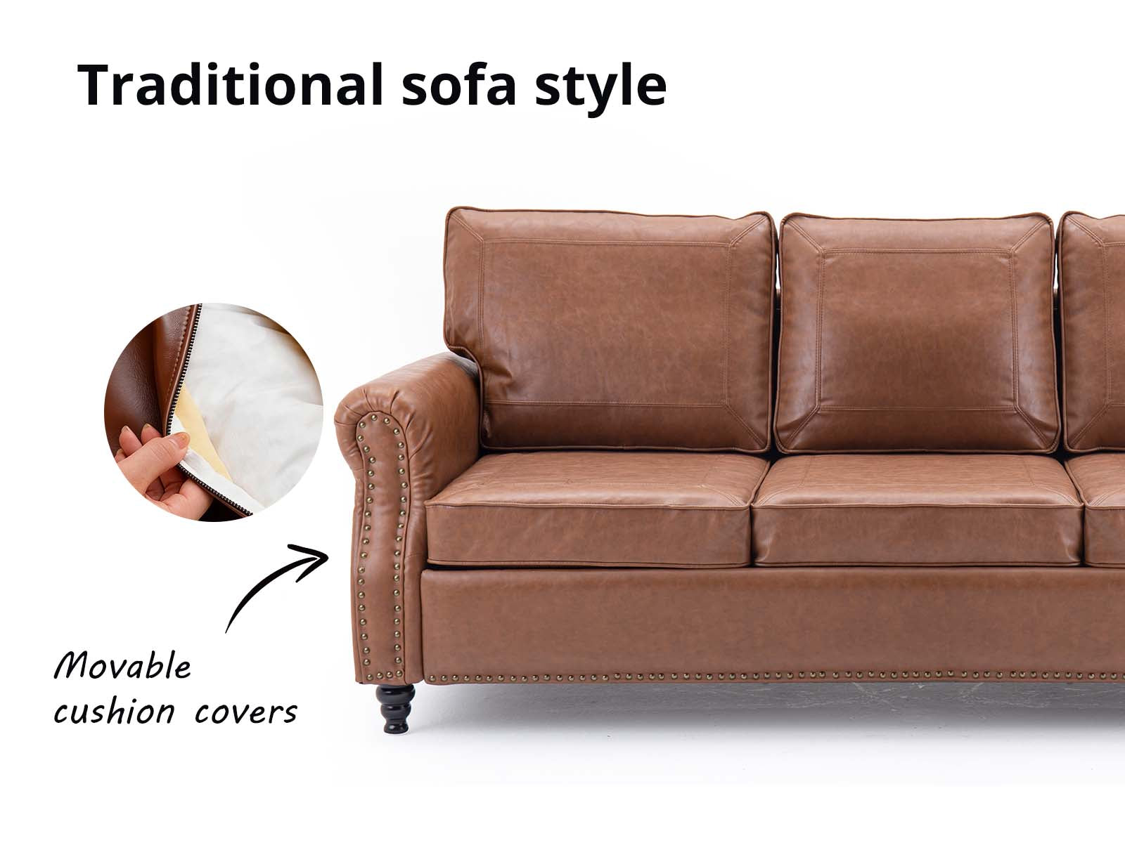 Cassandra faux leather 3-seater sofa couch brings a traditional flair to your living room with nailhead trim. It's crafted from solid and engineered wood and wrapped in deluxe PU faux leather for a rustic touch. Its leather upholstery is resistant to tears, so it stands up to everyday use. It's filled with foam, pocket springs and sinuous springs to give you plenty of support as you relax after a long day. A cushioned back, rolled arms and bun legs give this sofa a classic silhouette. Partial assembly requires more color options for your choice.