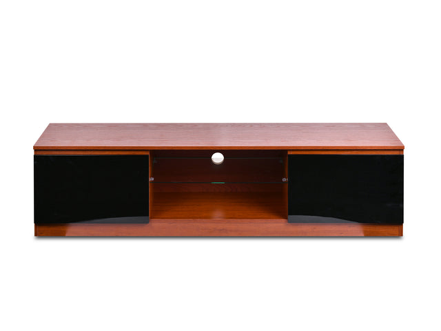 This stylish Entertainment Unit With Cabinets features a beautiful walnut matt body with striking black high gloss front panels. Perfect for most TVs. The unit features a cabinet on each side with a door and open storage in the center for your media devices. A convenient cable hole keeps cords tidy. The rich wood finish adds warmth to any living room. This TV stand comes with all fittings and hardware needed for easy setup. The modern design with glossy black accents makes it a great centerpiece for your entertainment area.