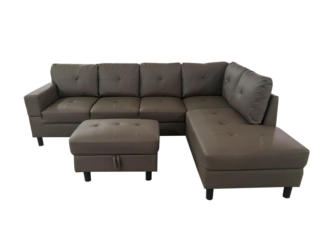 Relax in comfort and style with the Loriece PU Leather Sofa with Ottoman in brown. Crafted with a sturdy wooden frame and premium foam padding. This corner sofa offers exceptional comfort for lounging, watching TV, or enjoying time with family. The clean design is complemented by a soft PU leather finish that adds a touch of elegance to your space. The included ottoman offers additional storage, making it a practical and stylish addition to any room. Easy to assemble and built for durability, the Loriece sofa set is perfect for modern living.
