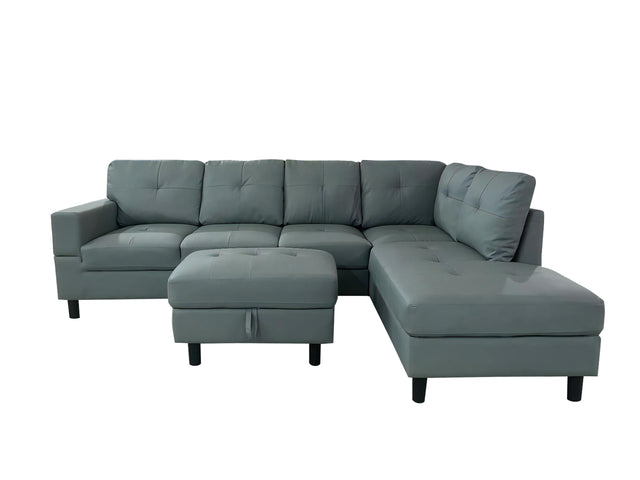 Relax in comfort and style with the Loriece PU Leather Sofa with Ottoman in grey. Crafted with a sturdy wooden frame and premium foam padding. This corner sofa offers exceptional comfort for lounging, watching TV, or enjoying time with family. The clean design is complemented by a soft PU leather finish that adds a touch of elegance to your space. The included ottoman offers additional storage, making it a practical and stylish addition to any room. Easy to assemble and built for durability, the Loriece sofa set is perfect for modern living.