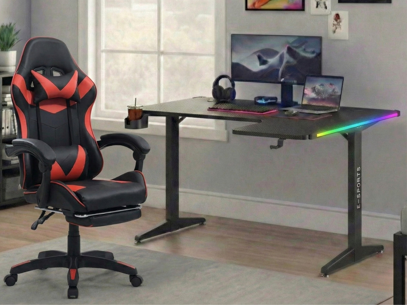 Upgrade your gaming or study setup with the L-shape gaming desk. This gaming desk offers a spacious and ergonomic workspace with smart storage options. The strong carbon steel frame ensures lasting stability. The carbon fibre textured tabletop adds a sleek, modern look. With dynamic multi-function 256-colour LED lighting, headphone hooks, and a cup holder. This computer desk delivers comfort, style, and immersive performance.