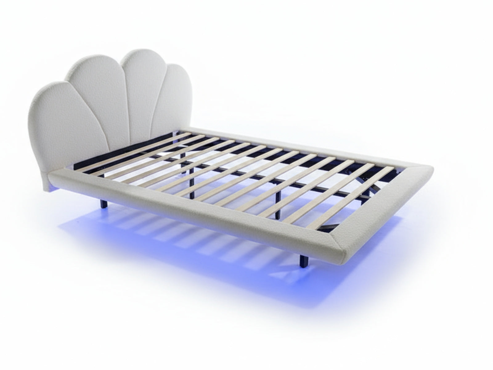 Add a unique touch to your bedroom with the Joleen Boucle Bed Frame. The bed frame is upholstered in soft boucle fabric. It features an elegant shell-shaped headboard that offers stylish support for reading or relaxing. The flat wooden slatted base ensures strong, stable support for restful sleep. Built-in 16-colour LED lighting with 4 flashing modes to enhance your bedroom ambience.