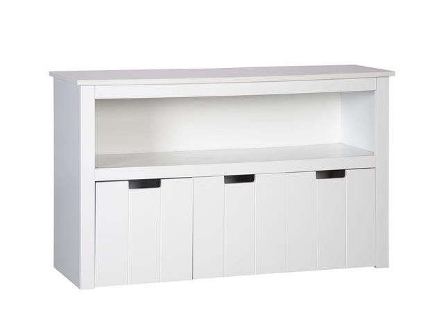 The toy chests and toy storage are made of high-quality MDF wood, which is sturdy and durable, and the surface is painted with environmentally friendly white paint. The toy boxes for kids consist of a shelf and 3 drawers with wheels for storing toys, books, socks, and other sundries. All drawers are detachable, and each drawer has 4 spinning wheels, which makes it easy to move this cabinet to where you want to organize and put it back in place. This storage chest can not only be used as a storage cabinet, but also as a small table for kids: after removing the movable drawer, the kids can do homework and draw here. Simple and coloured toy box that goes perfectly with your home, suitable for kindergarten, nursery, kids' room, living room, and playroom to keep them clean and tidy.
