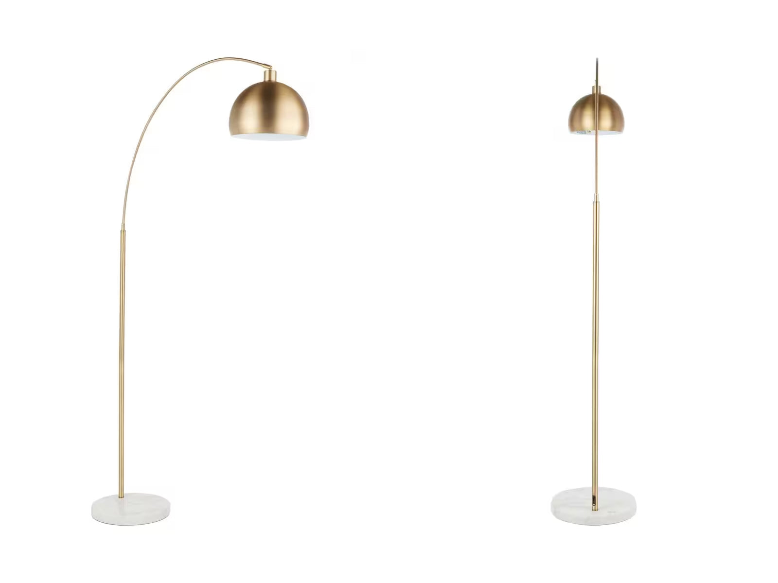 This elegant, contemporary floor lamp by Arteco Floor Lamp White Marble Base Design features the light on an arched arm, perfect for placement behind a sofa or sectional. Metal shade and column in gold finish with white marble base. Lovely for a modern or eclectic decor.