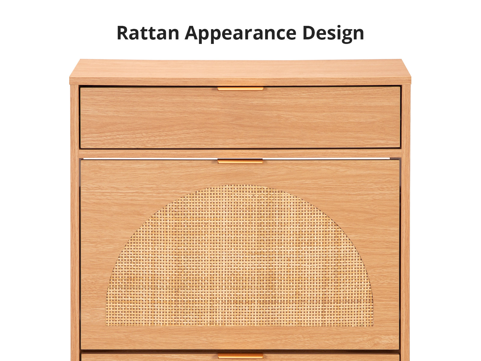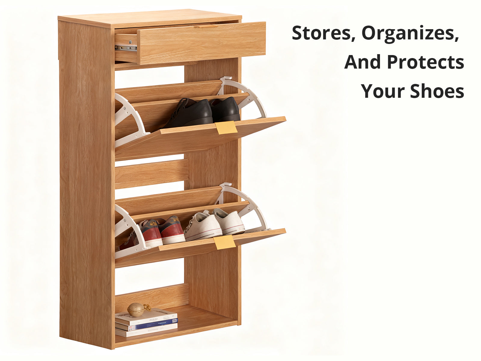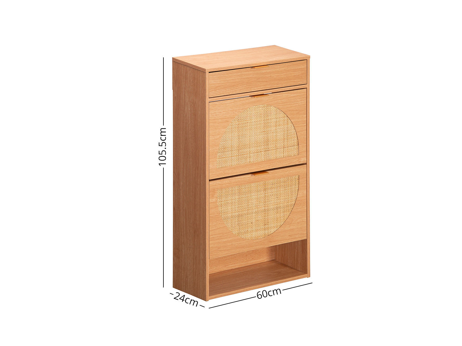 Featuring particle board with paper veneer and a sleek, stylish contemporary design, this quality-made shoe cabinet easily matches any décor. It’s constructed with two large storage cupboards that store more than 8 pairs of shoes. Keep everything free from dust with the cabinet closing doors that help keep unsightly shoes out of view and under control. Furthermore, the upper cabinet and an open shelf underneath offer more space for your little collectibles and shoes. Great for organizing your favorites, just perfect for your storage needs.