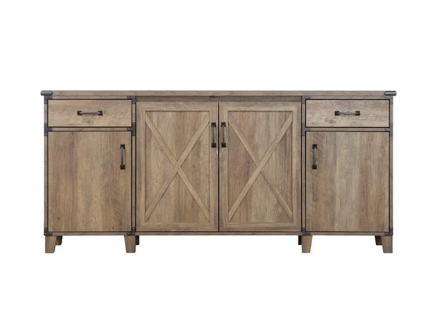 Expand storage and functionality in a charming home office with this spacious 4-Door Cabinet Rustic Oak. Complete with a wide top that offers a spot for decor or office essentials. Abundant interior storage is split into a large two-door cabinet, two one-door cabinets, and two drawers, allowing for easy organization that keeps your workspace efficient and tidy. The credenza features a rustic oak wood grain finish and is adorned with farmhouse details like X-cross trim on center doors and contrasting hardware and brackets that create depth. This multi-functional piece easily doubles as a sideboard in the dining room or a storage piece in your stylish family room.