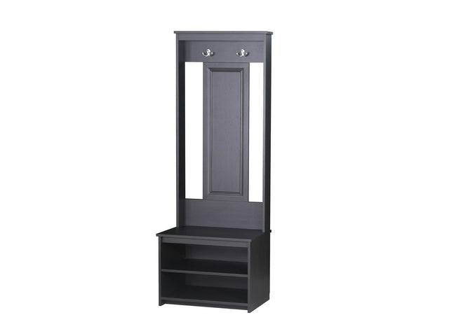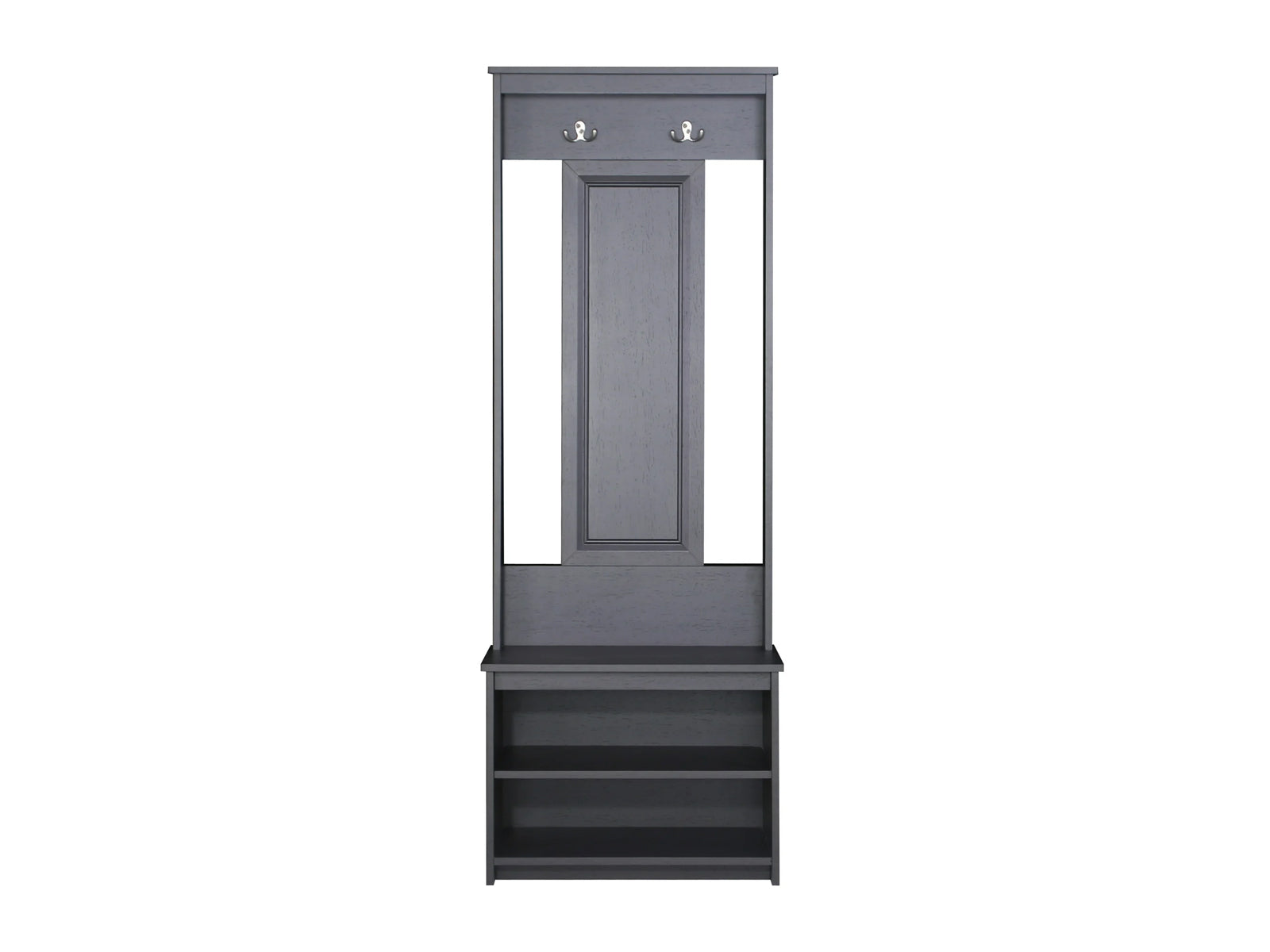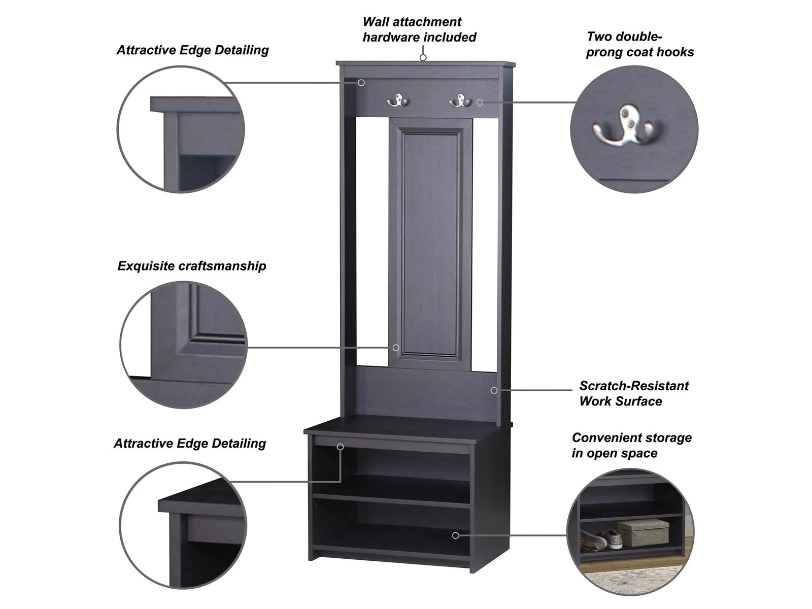 Delivering a compact silhouette, this Hall Tree And Shoe Bench Antique Black brings welcoming style to your entry. Complete with damage-resistant laminate surfaces, it delivers easy refinement and impeccable functionality for a composed look in a foyer or mudroom. The shoe bench is augmented with two shelves underneath, great for containing shoes and keeping the walkway free from clutter. Coat hooks add a place to stash jackets, hats, and more.