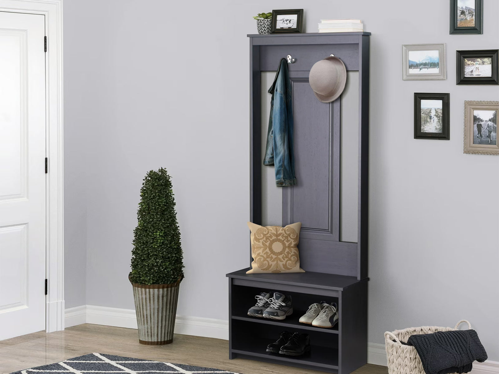 A casual contemporary hall tree creates a composed look and adds storage to an entry or mudroom.