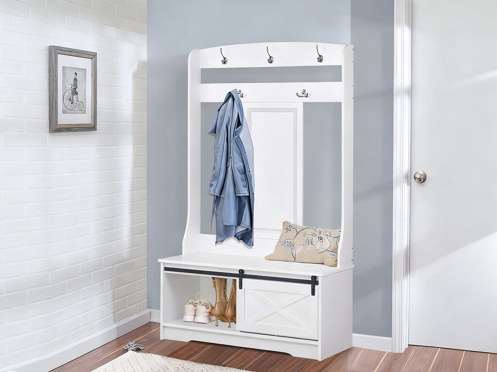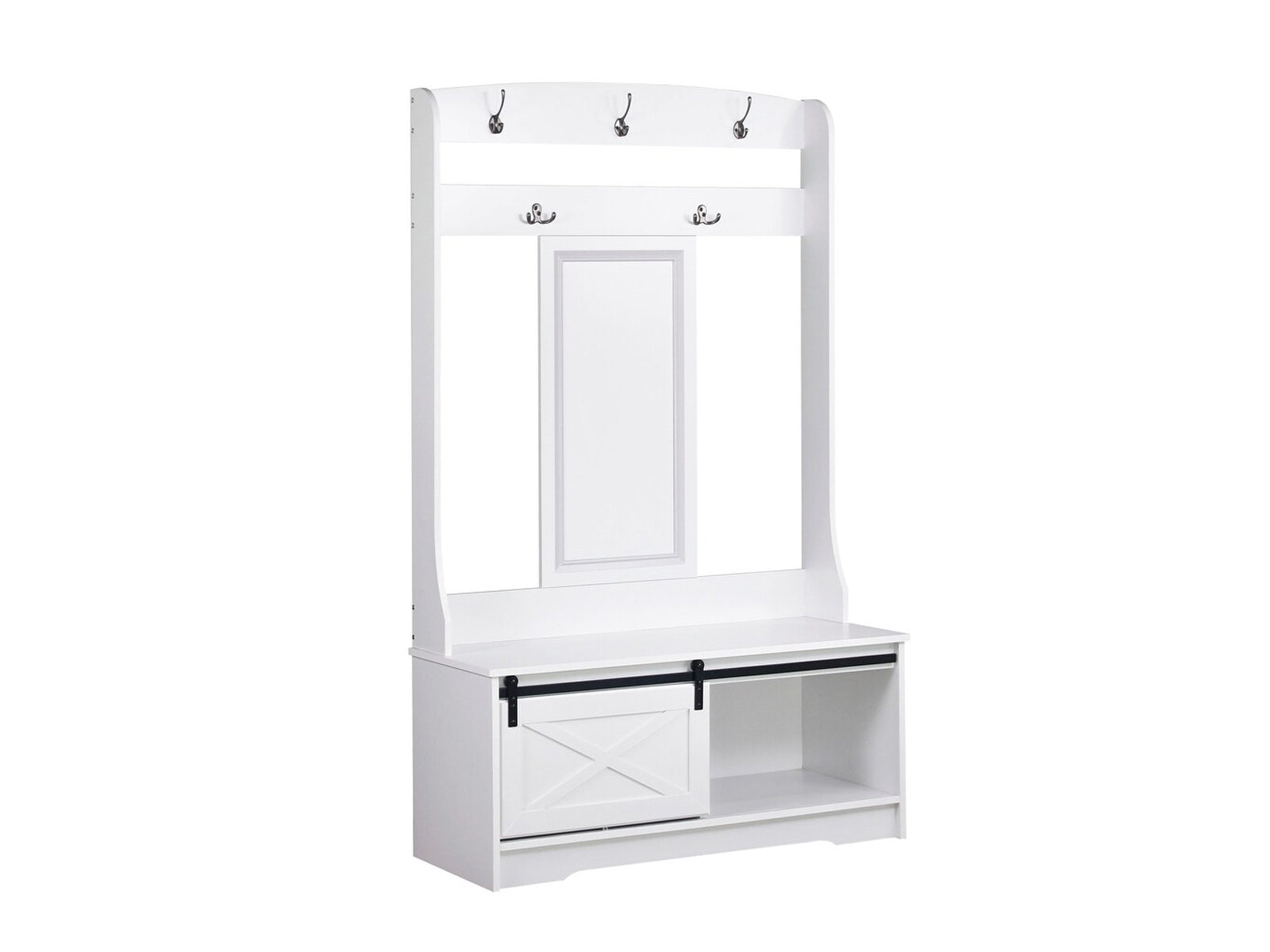 Create easy organization and style in your entryway or mudroom with this Transitional Hall Tree And Shoe Bench White. Multiple double-prong hooks make it easy to keep bags and coats off the floor, while the lower cabinet adds plenty of space to keep shoes out of the way. The wide bench adds convenience and a welcoming sensibility. This hall tree is constructed with a laminate surface for durability and includes anti-tip wall attachment hardware for peace of mind.