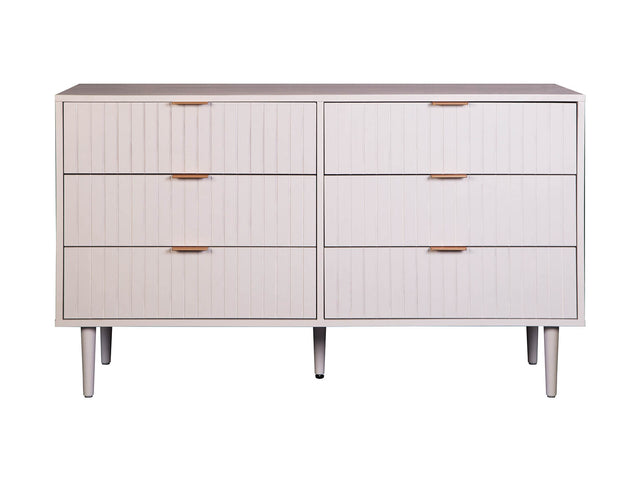 Add simple elegance to your space with the Swansea Collection. The Swansea 6-Drawer Lowboy blends modern style with everyday function. It includes six deep drawers on smooth metal runners for easy storage. Each drawer has contrasting elegant rose gold handles with gorgeous and on-trend panelled detail on the front. Made from durable particleboard with a melamine finish, it's built to last. Solid wood legs and metal handles provide strong support and a stylish touch. With clean lines and a classic design, it’s the perfect fit for any modern bedroom.
