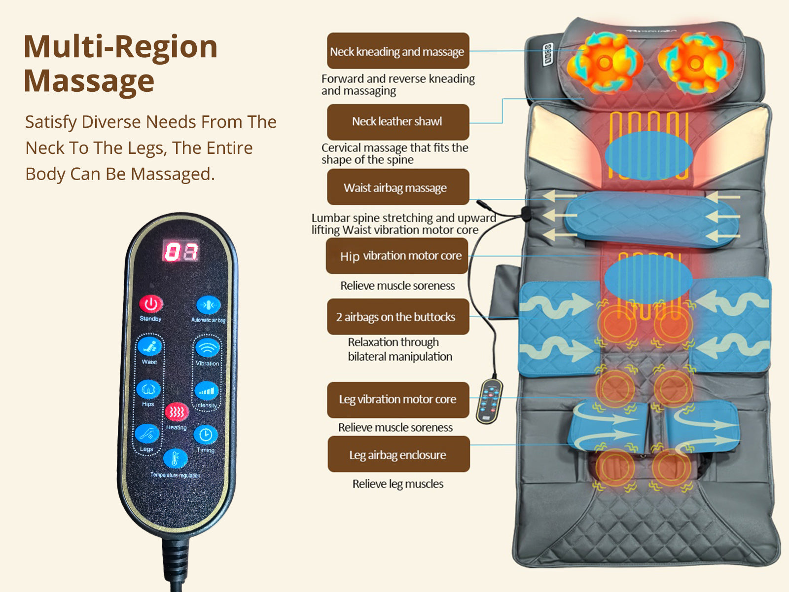 Novello Full Body Massage Mat with Air Press Calf Band is suitable for all-around massage of the neck, waist, buttocks, legs, and back. It can provide comfort, relieve pain, eliminate fatigue, and reduce stress.