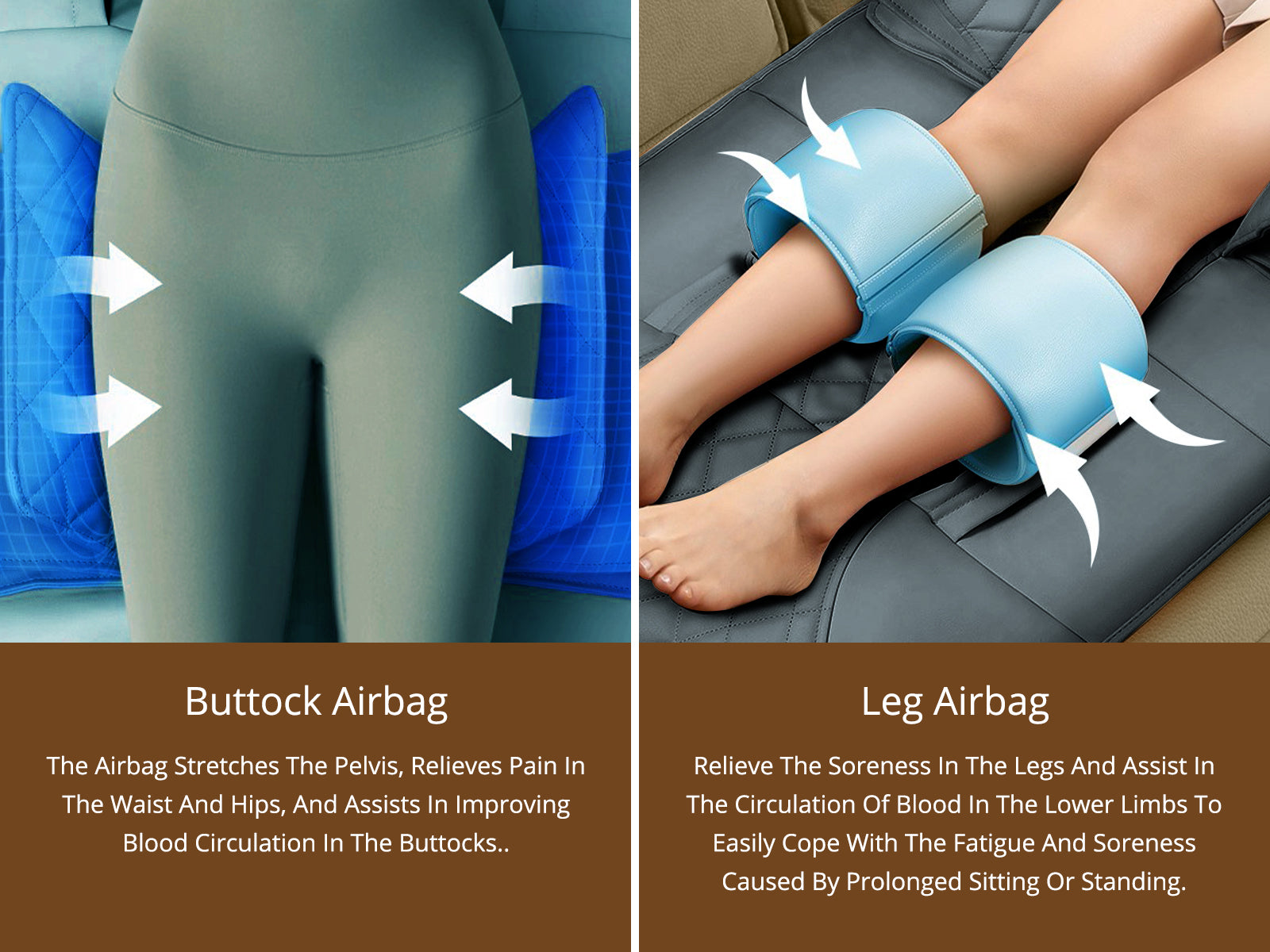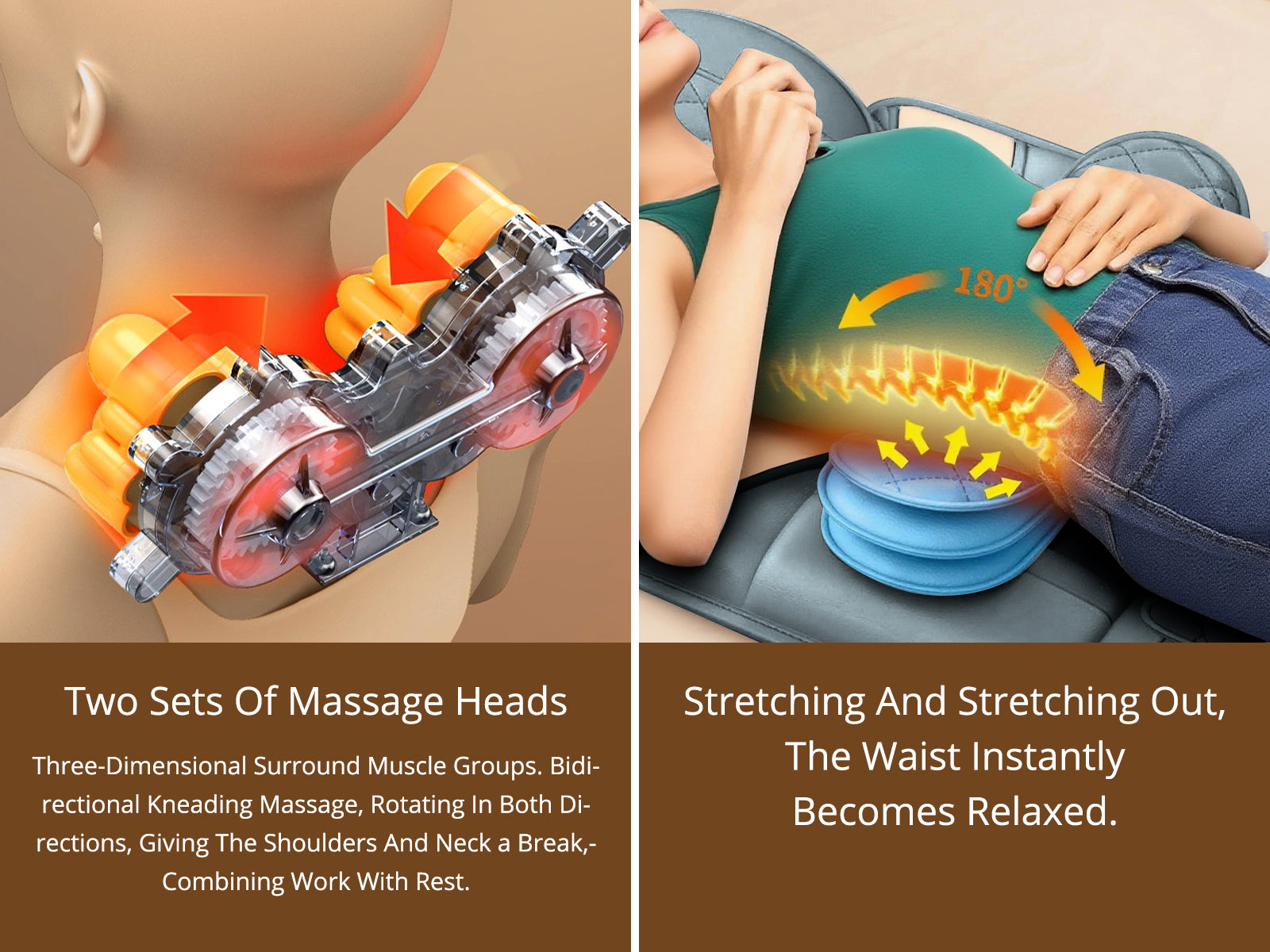 The neck is warmed and kneaded; the waist is heated(Constant temperature: 38-40 degrees Celsius, 107.6 degrees Fahrenheit. Temperature may not be obvious in summer), and an airbag is added to manually massage, control the air cap, and make the waist massage more comfortable.