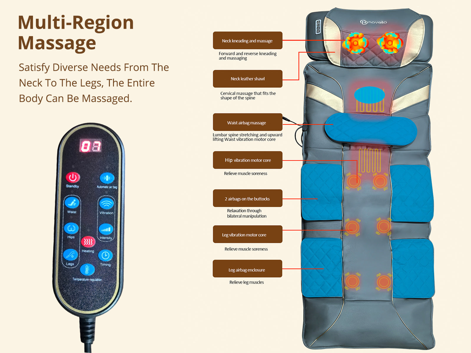 Novello Full Body Massage Mat with Air Press is suitable for all-around massage of the neck, waist, buttocks, legs, and back. It can provide comfort, relieve pain, eliminate fatigue, and reduce stress.