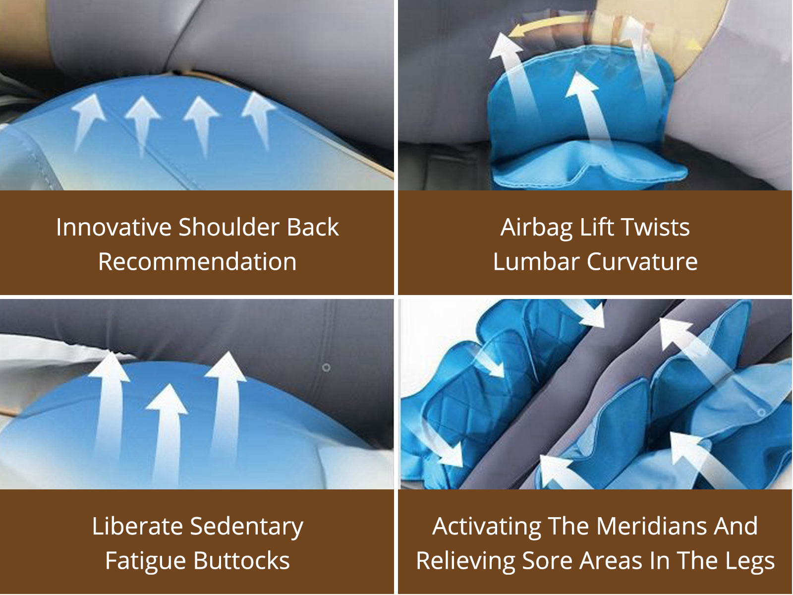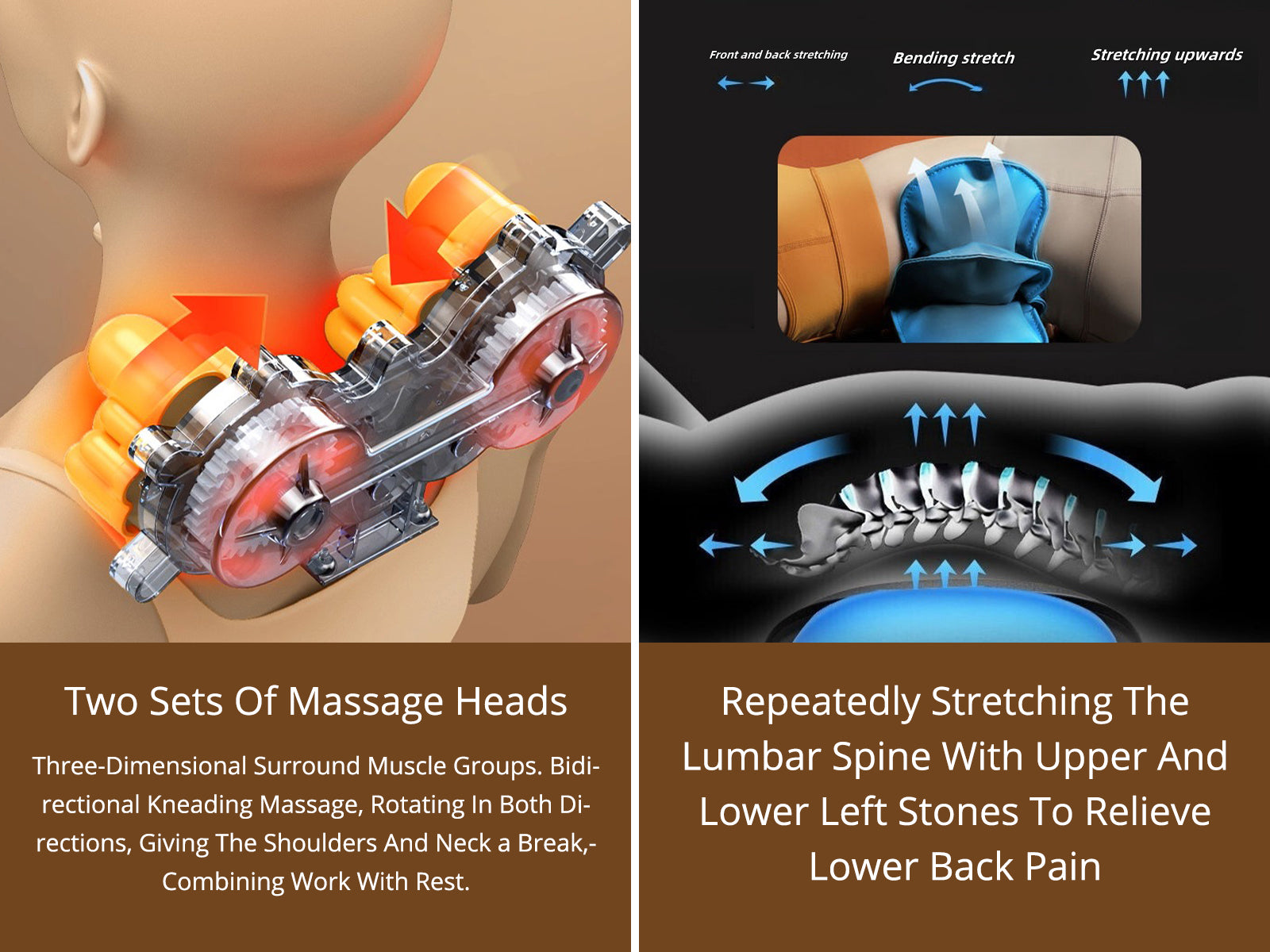 The neck is warmed and kneaded; the waist is heated(Constant temperature: 38-40 degrees Celsius, 107.6 degrees Fahrenheit. Temperature may not be obvious in summer), and an airbag is added to manually massage, control the air cap, and make the waist massage more comfortable.