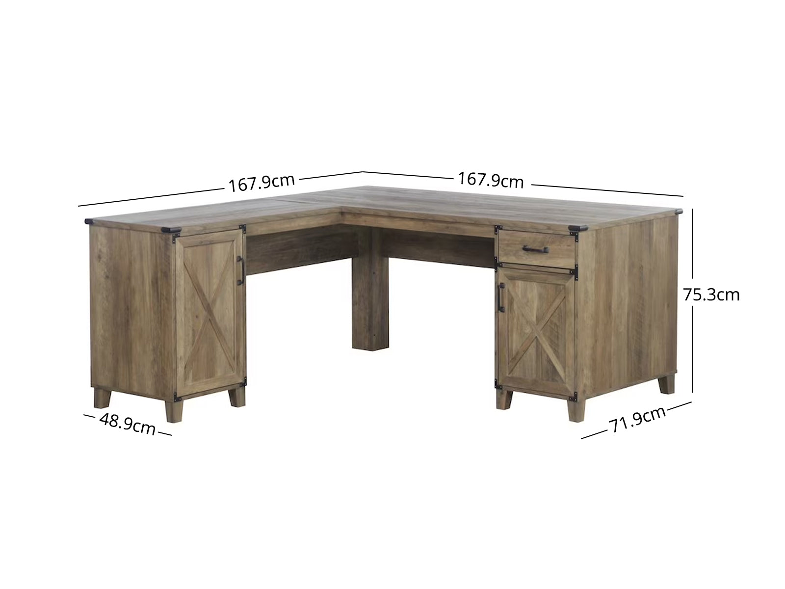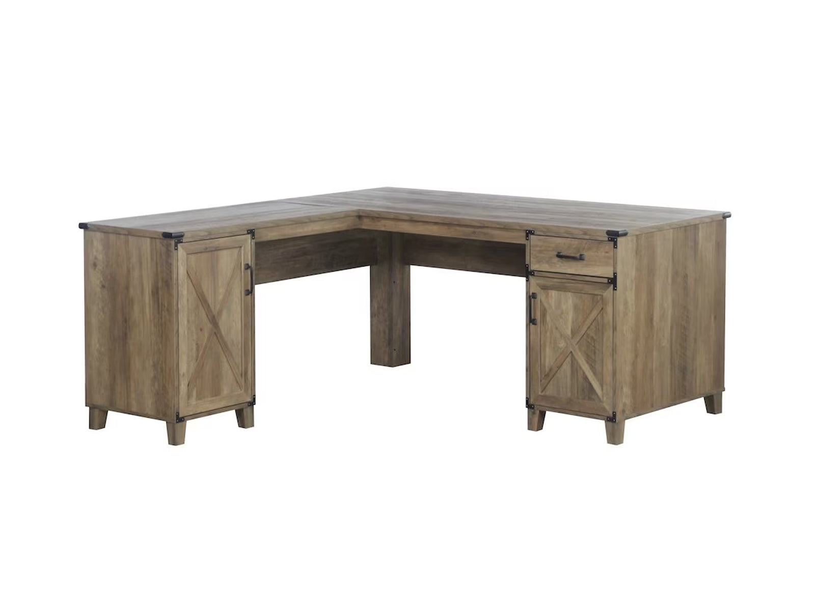 Reinvent your home workspace with a L-Shaped Desk Rustic Oak. The perfect anchor for a stylish space, it delivers casual farmhouse character with a rustic oak wood grain finish and contrasting hardware. Bracket details augment classic door and drawer pulls, and doors show off X-cross trim details that evoke a classic barn door.