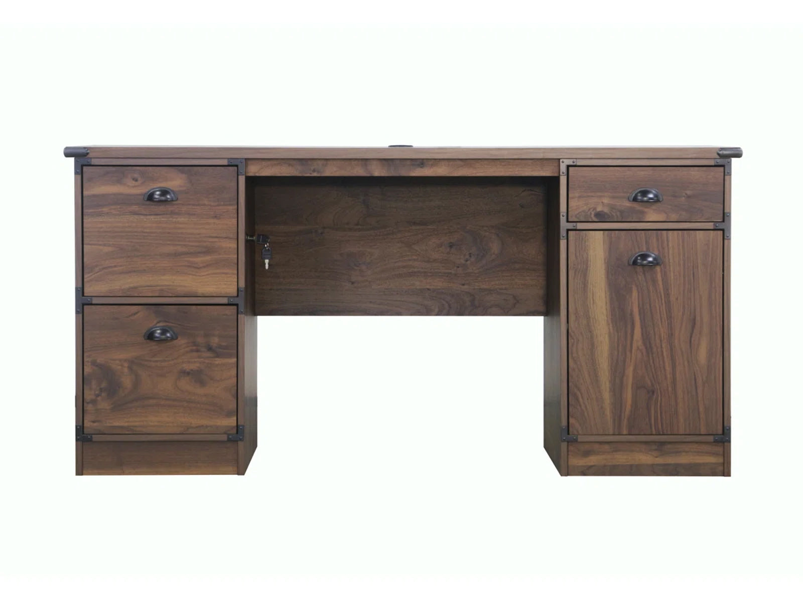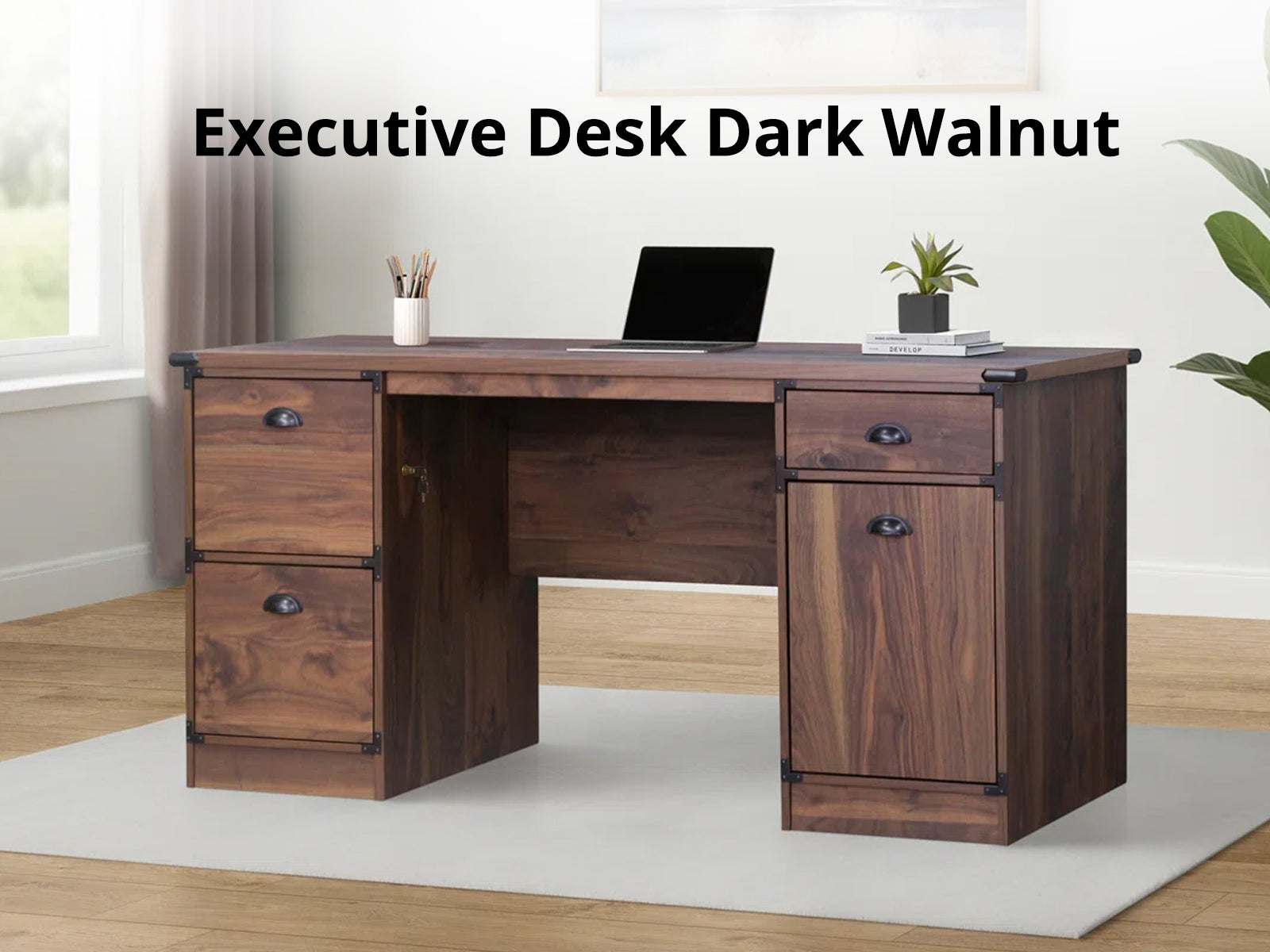 Create the home workstation of your dreams with this handsome, contemporary executive desk. In a dark walnut finish rich in dimensionality, the desk is finished on all sides and makes an excellent focal point when floated within your office or positioned against a wall. On the opposite side, an accessory drawer and a cabinet create a place for all your essentials, keeping them close at hand when they're needed. The desk is complete with a threading box on the top for cable management, maintaining a clean, professional look no matter where it's situated in your office.