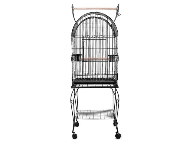 A fantastic home for your birds or small parrots. Made of sturdy and durable power-coated iron. The dome cage comes with a large access door, two side access windows to swing in the stainless steel feeders, two perches, and a removable tray for easy clean-up. Better still, the domed roof can also be opened from the top. It also features ample storage space at the bottom and elegant curved legs with castor wheels attached for easy mobility.