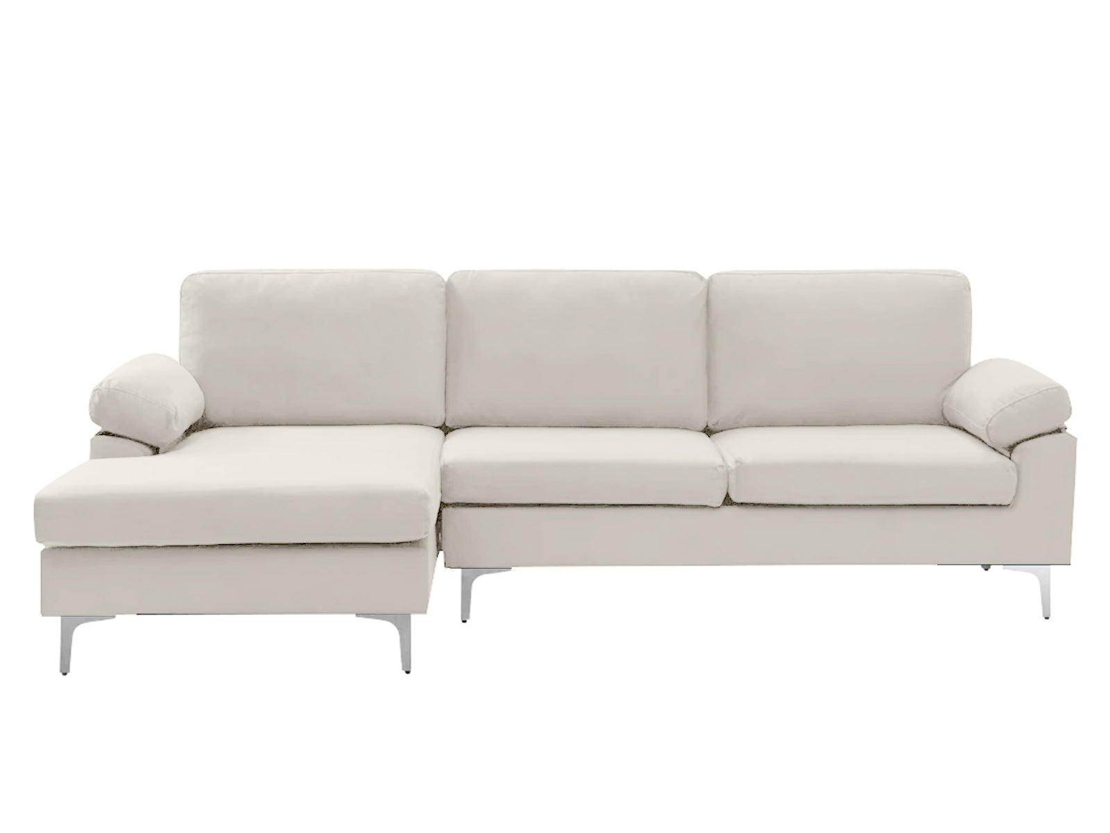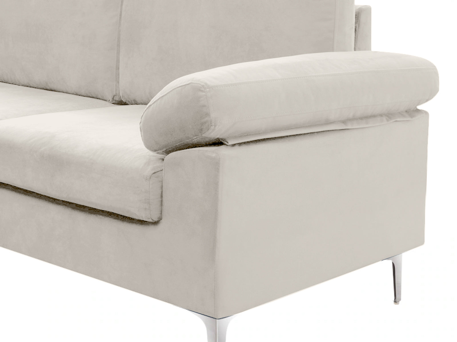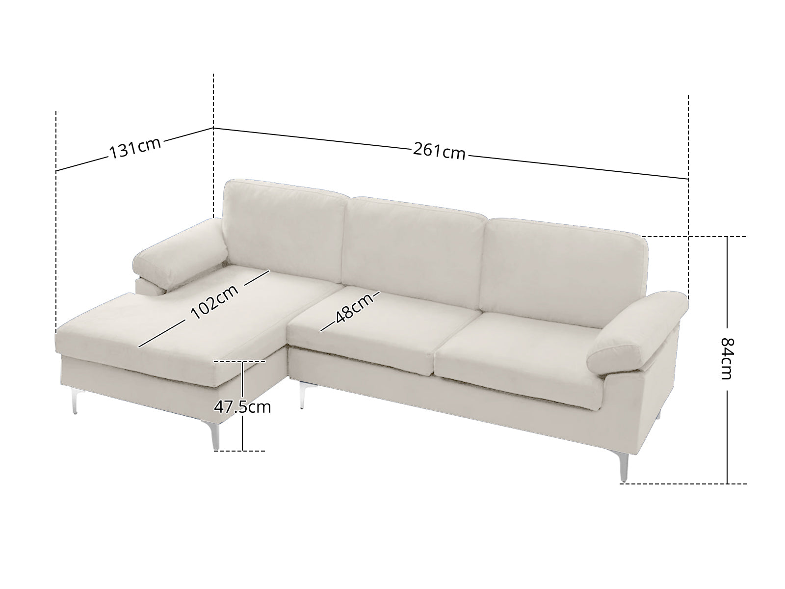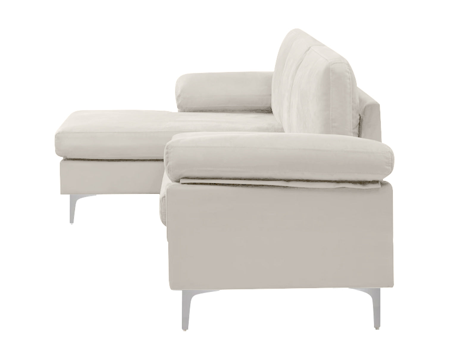 This Pauline Velvet Sectional Sofa is a perfect place to lounge, watch TV, or relax with family and friends. Constructed with a solid wood frame, filled with premium foams, and upholstered in soft velvet fabric, our sofa is sturdy in every way. The seats are comfortable with soft cushions and ample support for your back, too. This inviting design envelops you in a cozy embrace, making you feel instantly at ease and comfortable. Suitable for a variety of spaces and styles, this sofa offers you the ultimate experience and helps your body to fully relax. It will give your home the renaissance it deserves.