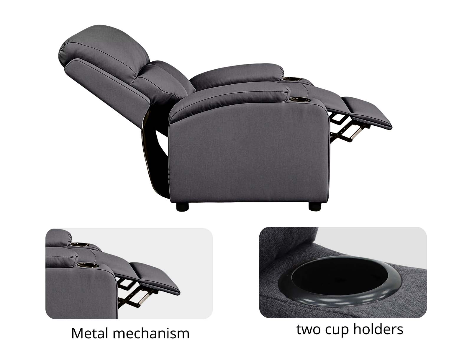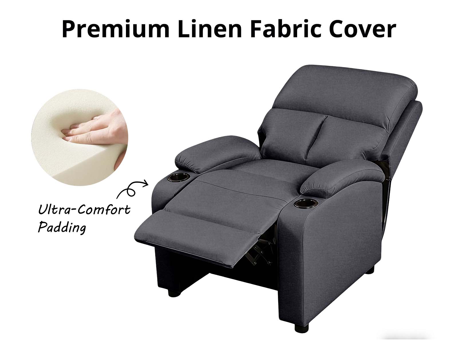 Take a seat and recline in seconds in this smooth and stylish Push Back Recliner Chair. Thick sponge padding and lightweight premium faux linen-touch fabric ensure long-lasting top-notch relaxation. Sink Into luxury overstuffed cushions with high-density foam offer cloud-like comfort, making it ideal for recliner chairs in the living room or bedroom. Convenience at two cup holders keeps everything within reach. Whether you're relaxing after work, watching a movie, or taking a nap, Zola Push Back Recliner Chair ensures every moment feels like home.
