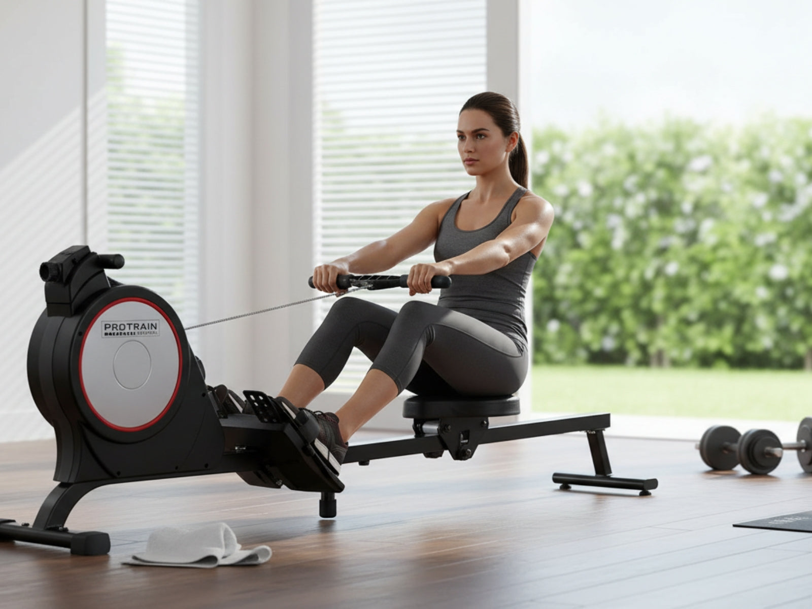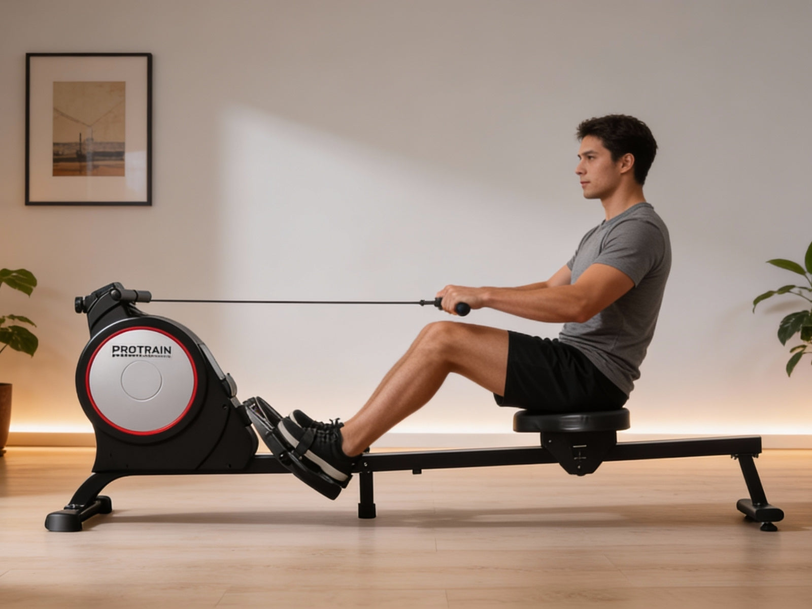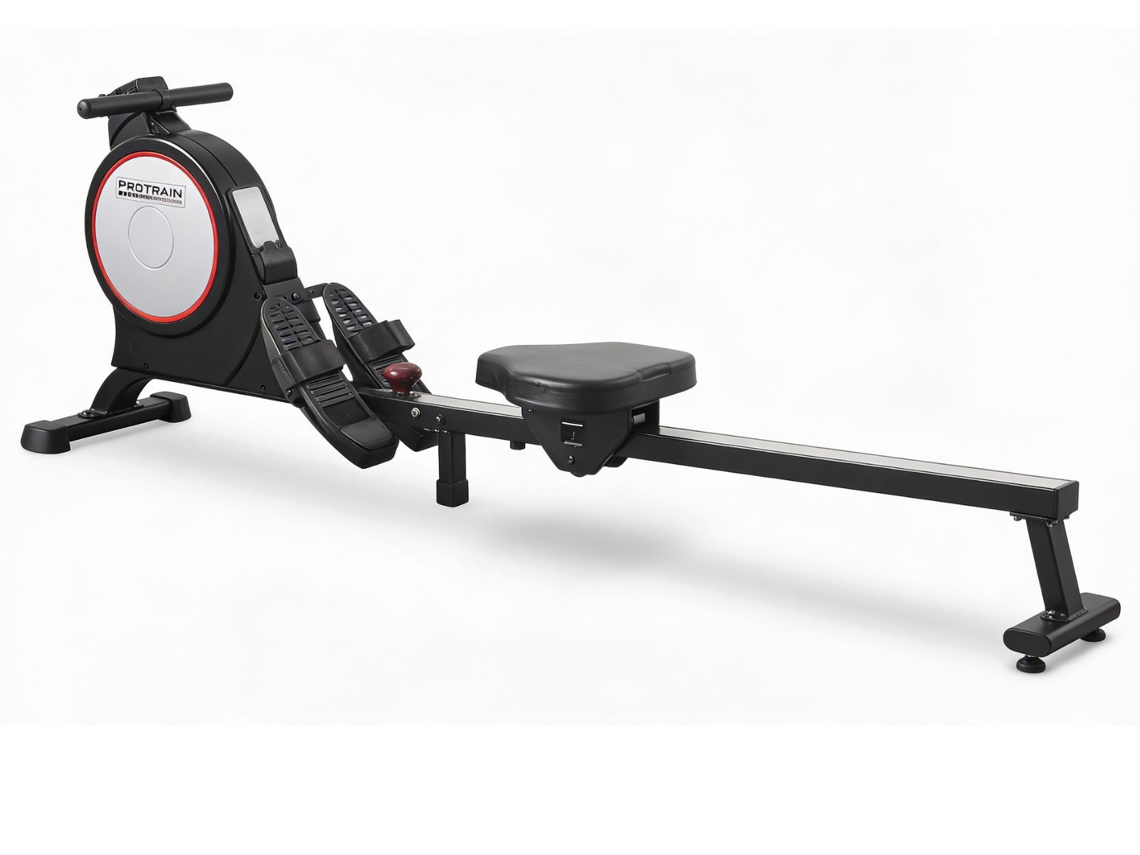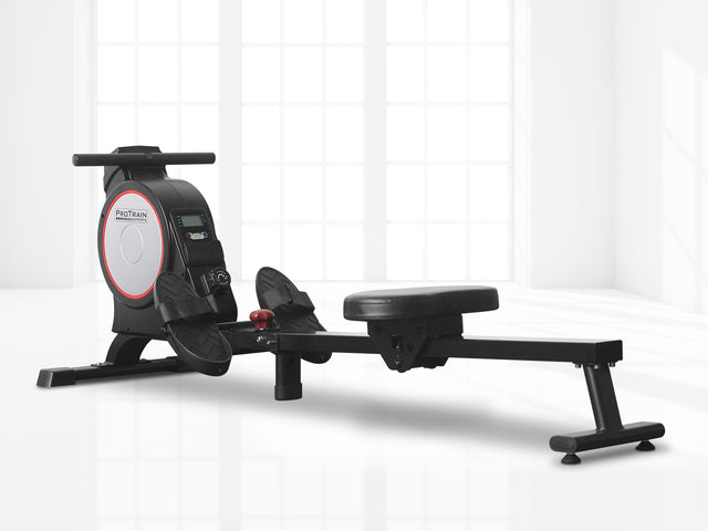 Simple but satisfying. Our Protrain Magnetic Flywheel Rowing Machine, utilizing a magnetic brake system, targets all the major muscle groups for well-toned abs, back and legs. Simply select the workouts you desire, with up to 8 levels of manual resistance, and monitor the progress on the large LCD display console. This fitness machine is just perfect for home fitness routines with its quiet operation and super sturdy frame.