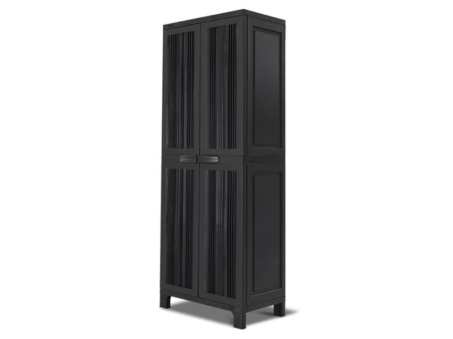 Organise your garden, deck, or garage with the Full-Size Outdoor Storage Cabinet. Built from durable plastic, this cabinet is weatherproof, rust-proof, and designed to last. Adjustable shelves at multiple heights provide versatile storage for tools and equipment of all sizes. The lockable doors provide added security. Elevated stilted feet keep items dry even during heavy rain. This cabinet keeps your outdoor space neat, tidy, and clutter-free.