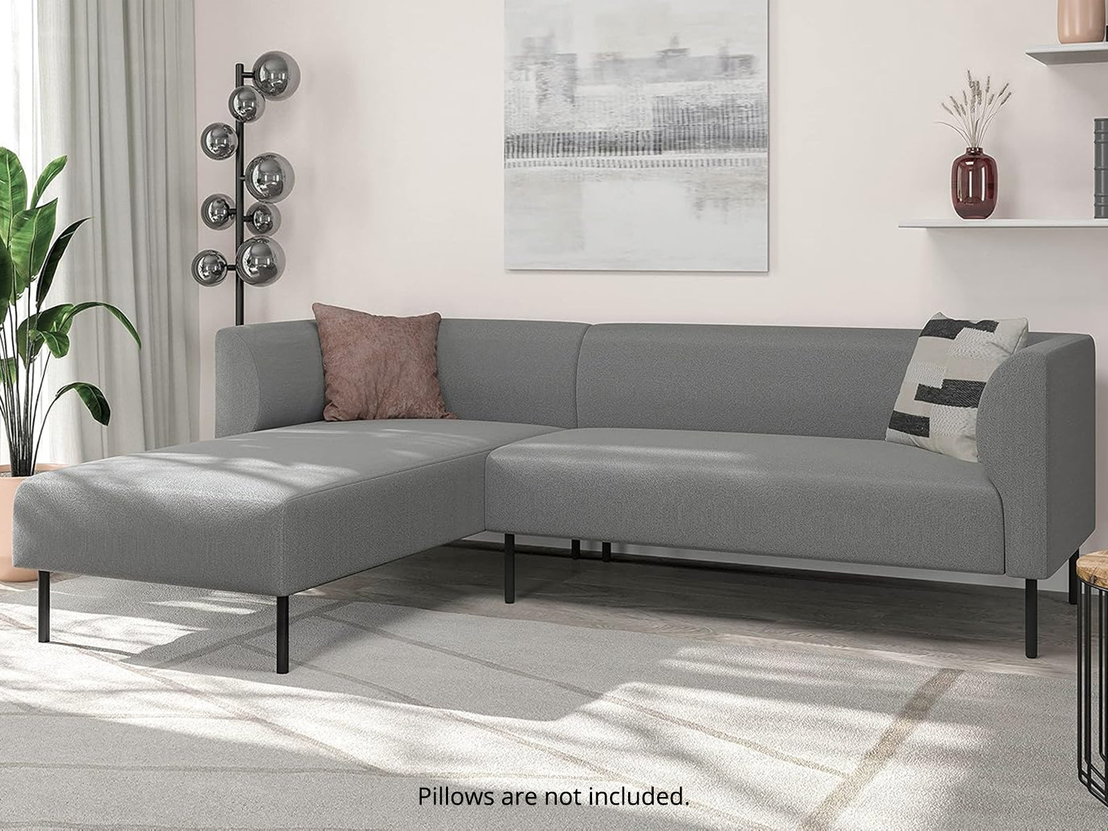 The Judith Sectional Sofa with Left Chaise offers you plenty of space. The sofa impresses with a timeless and modern design that sets a trendy accent in the living room. The armrests, seat and back are padded and invite you to relax, offering a high, very comfortable seating comfort. The sofa can be freely placed in the room thanks to the covered back. The elegant woven fabric cover in grey has a great feel and looks very elegant. The sofa has filigree feet made of black, powder-coated metal, which complete the modern design. Thanks to the simple, elegant design, the sofa can be individually combined and fits many interior styles.