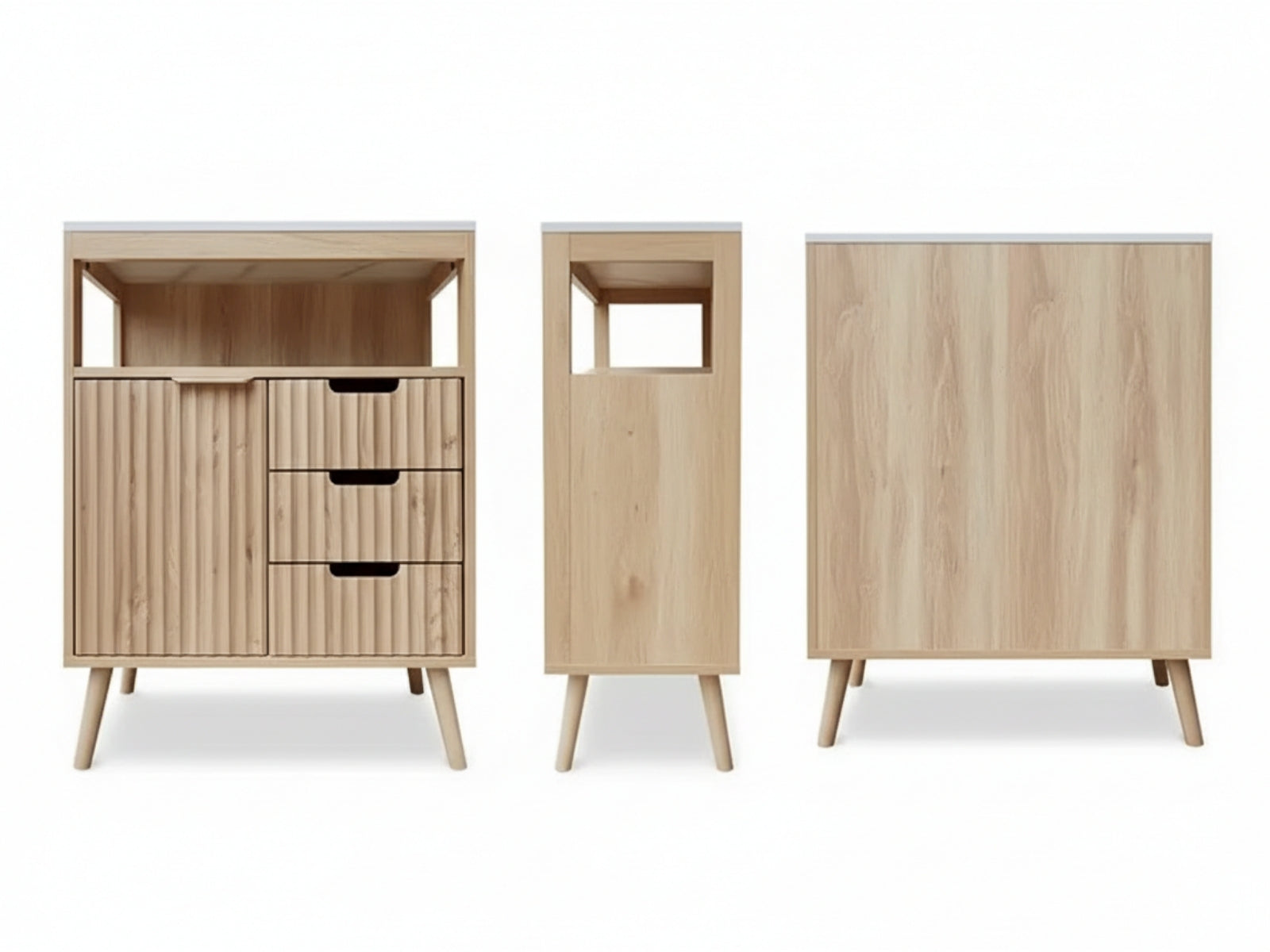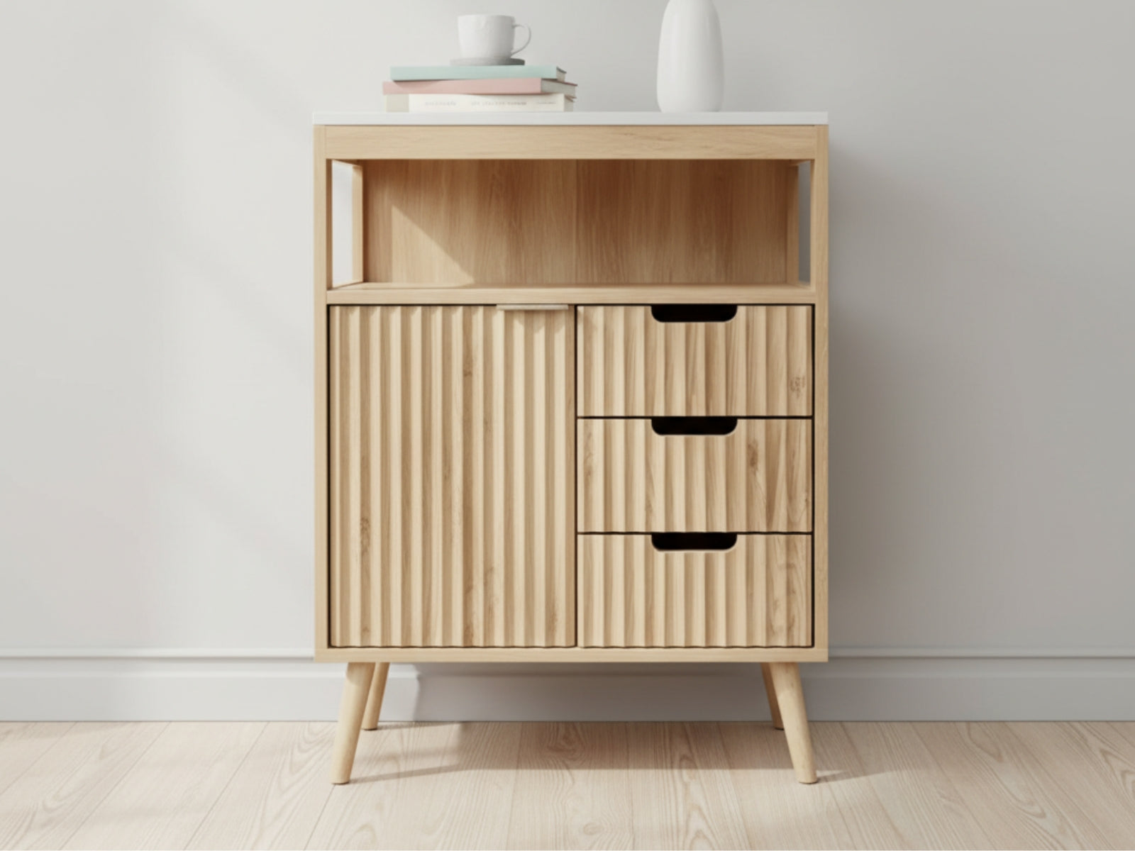 Our floor cabinet is a counter, cupboard, and storage space all rolled into one. The white faux marble top, adorned with earth-toned veins, perfectly complements the replicated natural oak grain and particle boards for solid construction. Not least, the waveform fluted panel design door catches also ensure that all items are kept securely in place behind closed doors.
