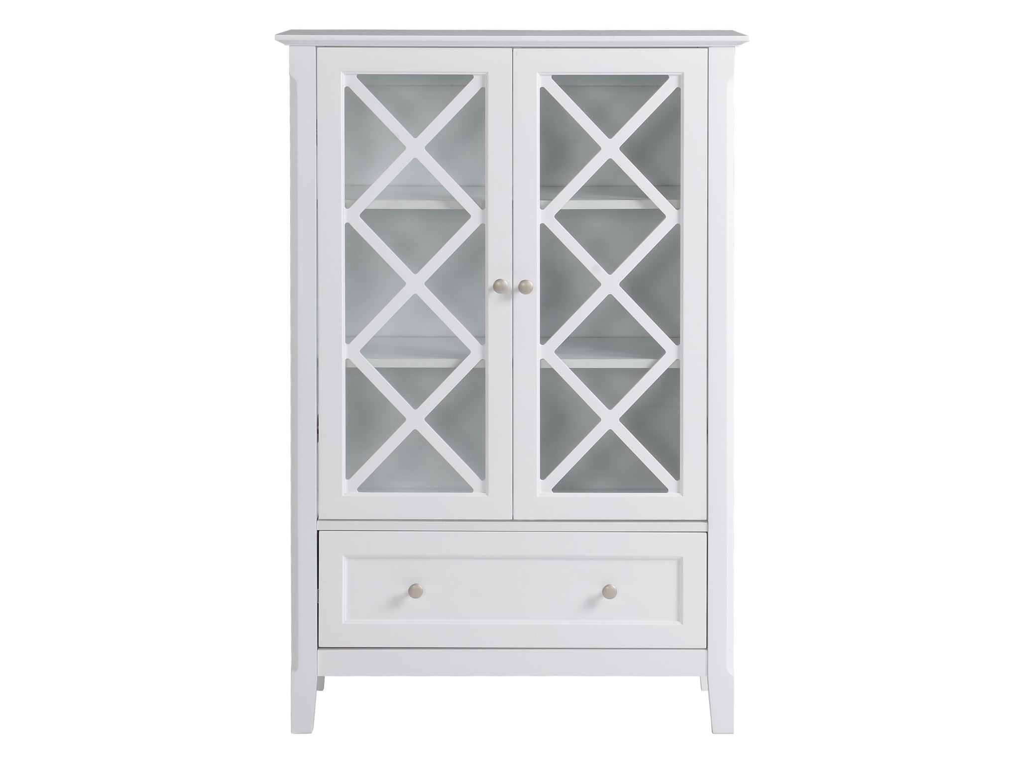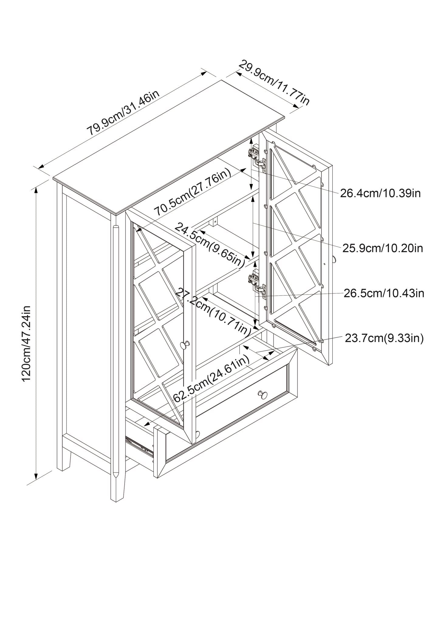 You will love this sophisticated and elegant piece at first sight. This accent storage cabinet blends unique details and brings extra storage and a lived-in feel to any corner with this classic two-door drawer cabinet featuring spacious storage. Constructed in MDF for durable, sleek metal handles, tempered clear glass with rhombus decor in detail presents its class look and versatility. With its perfect size, it is certainly a great addition to take your room style to the next level, no matter where you place it.